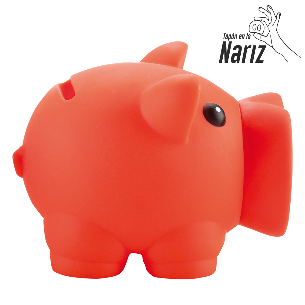 Alcancia en PVC con forma de cerdito. Medidas: 10 cm x 8 cm x 7 cm Marca: 5 cm / Tampografía