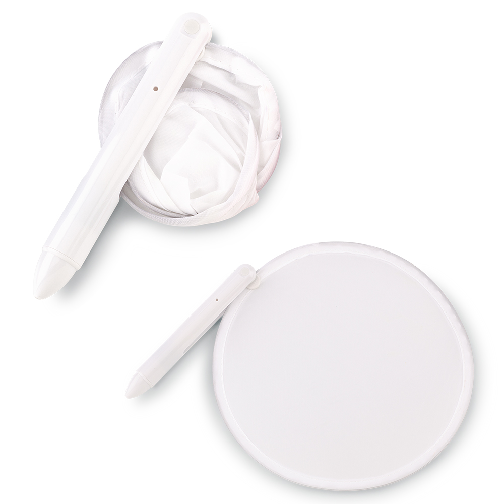 Bolígrafo plástico con abanico plegable en lona poliéster. Medidas: Bolígrafo: 13.5 cm / Abanico: 20.5 cm x 19.5 cm. Marca: Bolígrafo: 4 cm / Tampografía – Abanico: 8 cm / Screen.