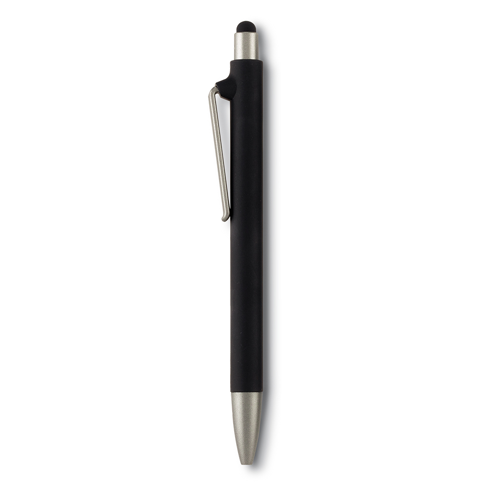 Bolígrafo plástico con stylus y clip metálico. Mecanismo push.