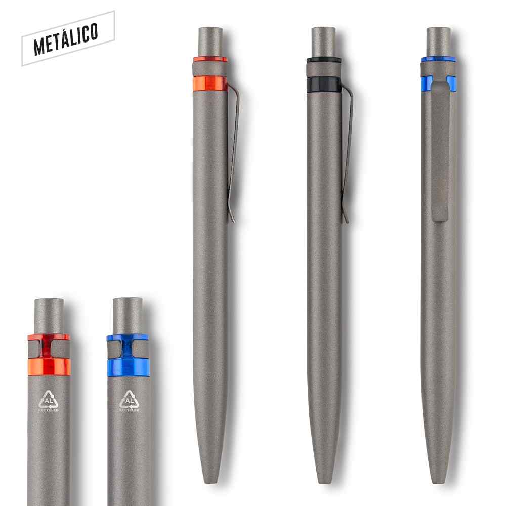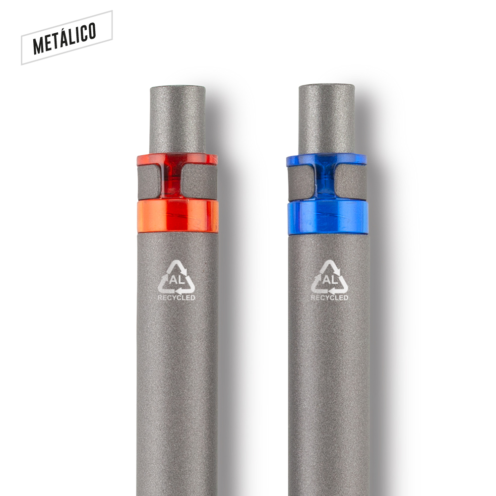 Bolígrafo elaborado en aluminio post-consumo. Clip metálico. Mecanismo push. Medidas: 14 cm . Marca: 3.5 cm / Láser