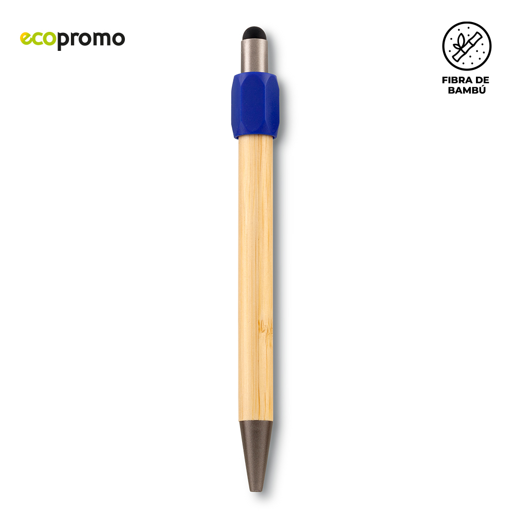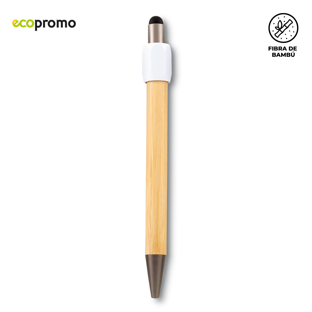 Bolígrafo en bambú con mecanismo push y stylus. Incluye un antiestresante giratorio. Medidas: 14.8 cm. Marca: 3.5 cm / Tampografía.