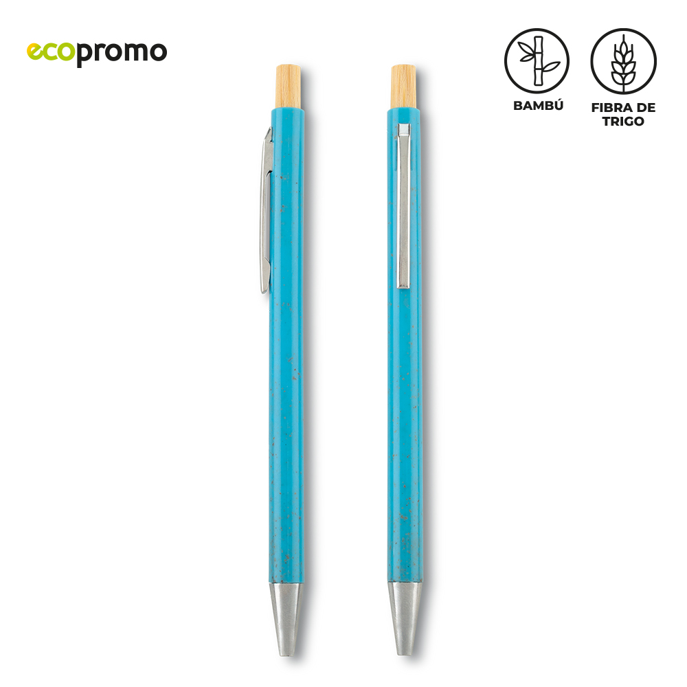 Bolígrafo plástico con mecanismo push, elaborado con fibra de trigo (50% aprox). El porcentaje de material ecológico tiene un promedio de biodegradabilidad de 2-3 años después del fin de su vida útil. Clip metálico. Medidas: 14 cm. Marca: 3.5 cm / Tampografía.