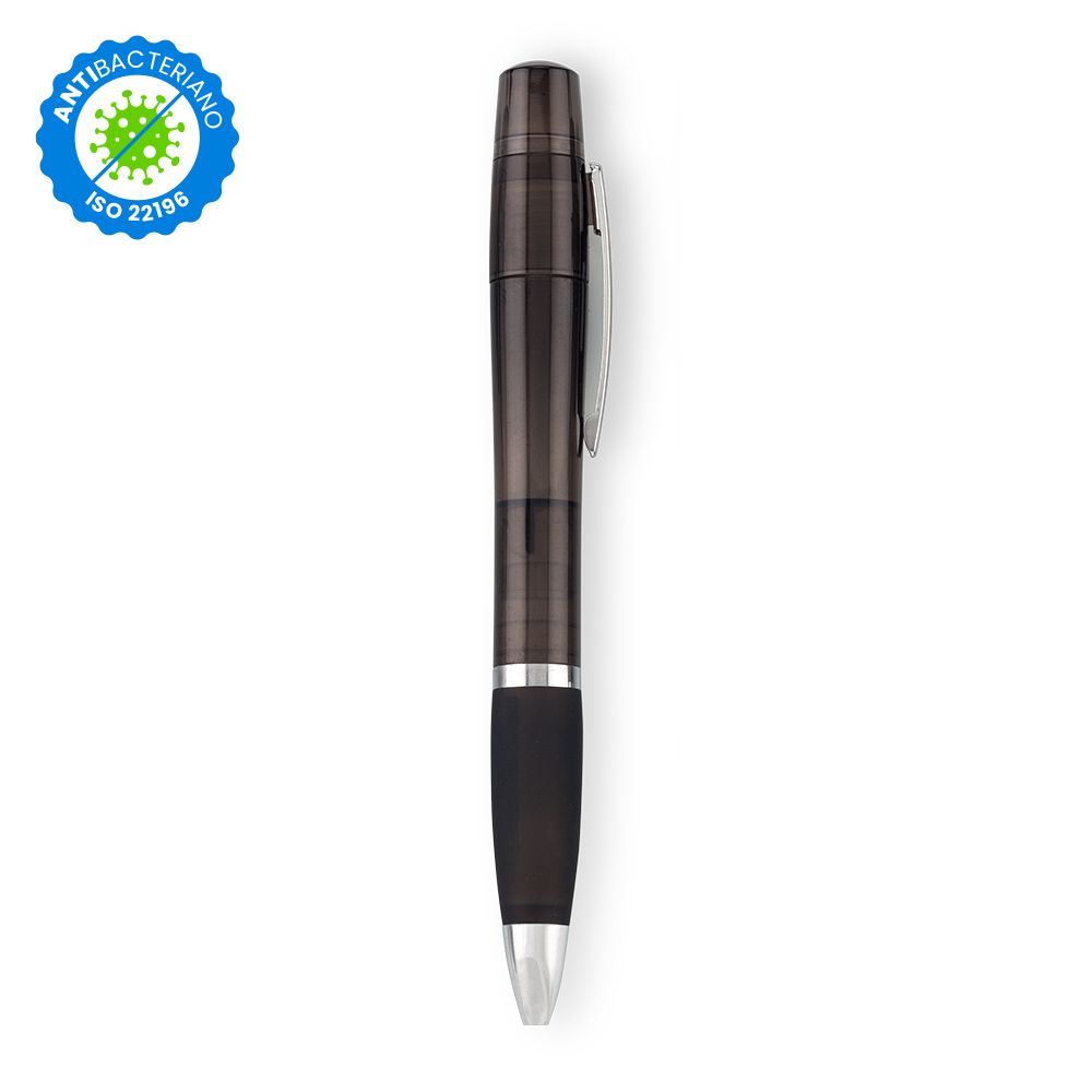 Bolígrafo plástico importado con clip metálico; barril antibacteriano tratado para inhibir y prevenir el crecimiento bacteriano sobre el cuerpo del bolígrafo gracias a la tecnología nano silver, un tratamiento especial realizado con iones de plata.
