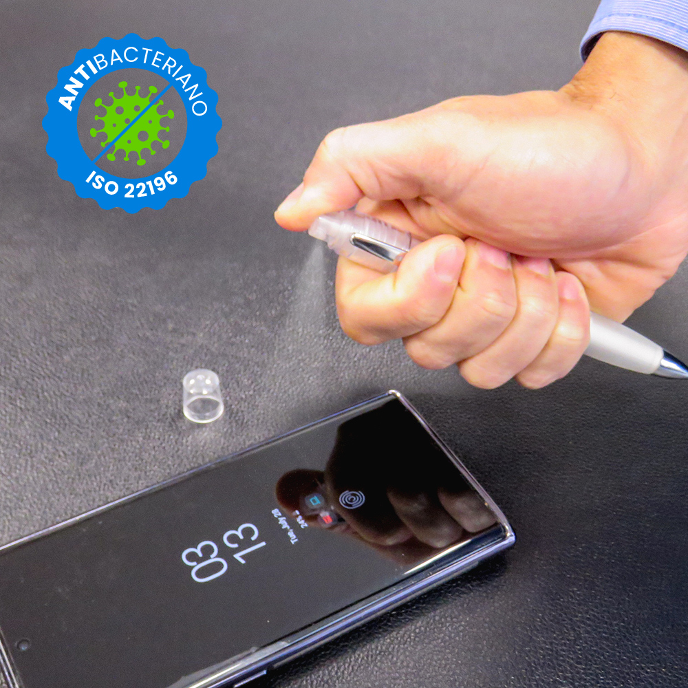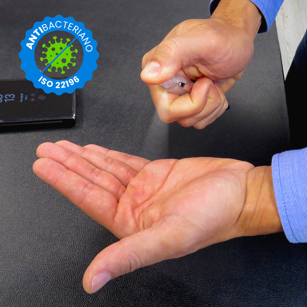 Bolígrafo plástico importado con clip metálico; barril antibacteriano tratado para inhibir y prevenir el crecimiento bacteriano sobre el cuerpo del bolígrafo gracias a la tecnología nano silver, un tratamiento especial realizado con iones de plata. Las bacterias al contacto con el bolígrafo se repelen y reducen hasta en 99%. Trabaja las 24 horas al día y permanece libre de microbios y bacterias. Material antibacteriano en cumplimiento de estándar ISO 22196: 2011 (Medición de la actividad antibacteriana en plásticos y otras superficies no porosas.) Mecanismo Twist en barril inferior. Capacidad para líquido 3.7ml (Entre 90-100 push del spray aprox). *Debido a…