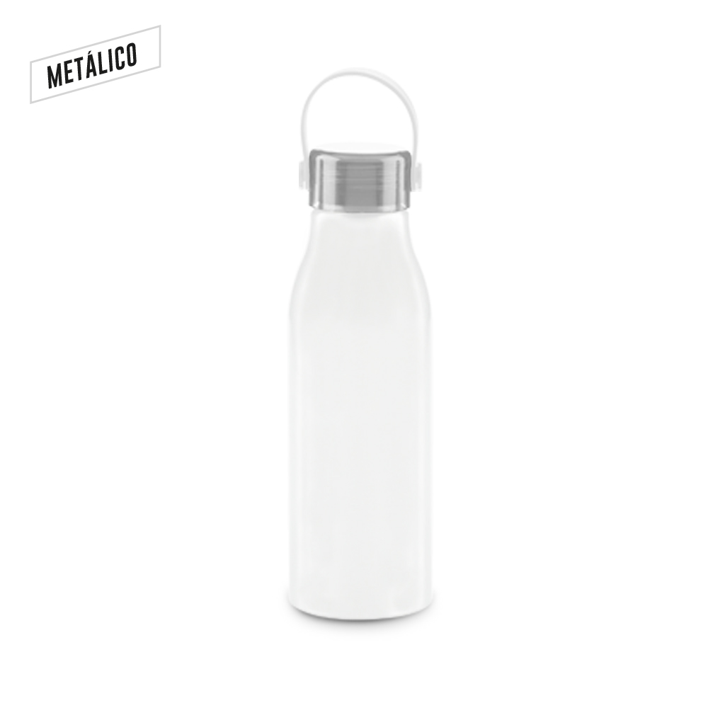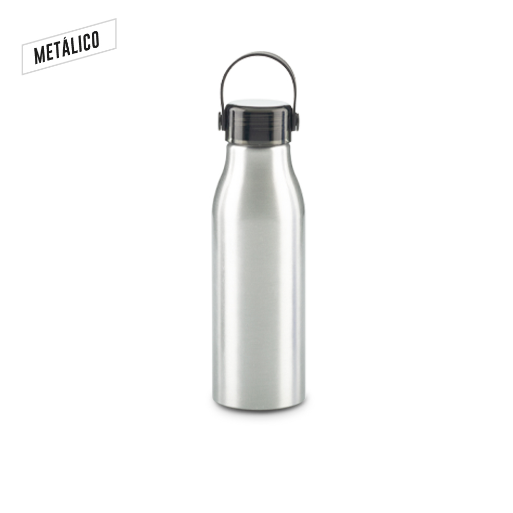 Botilito en aluminio con tapa rosca y agarradera en caucho. Empaque caja individual. Medidas: 23 cm x 7 cm. Marca: 5 cm / Tampografía, producto con tratamiento / Láser ( Líquido Oxidante en silver).