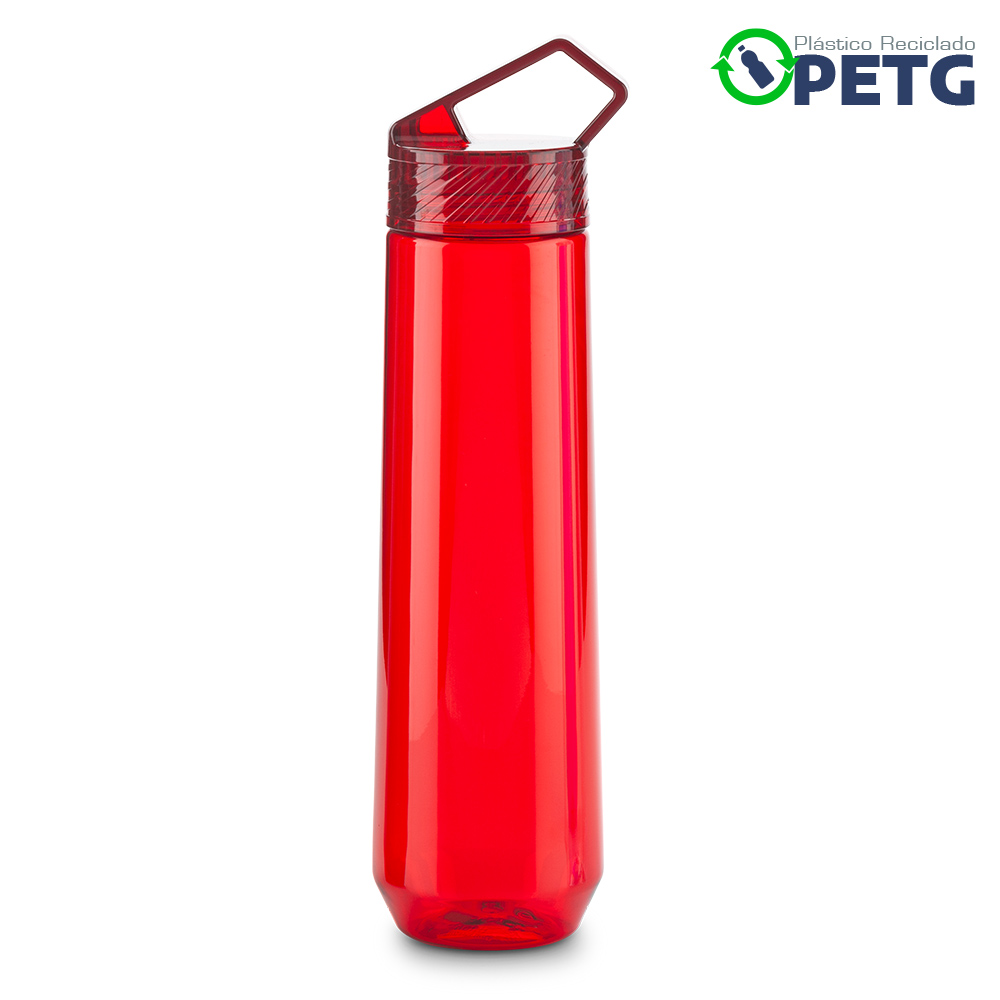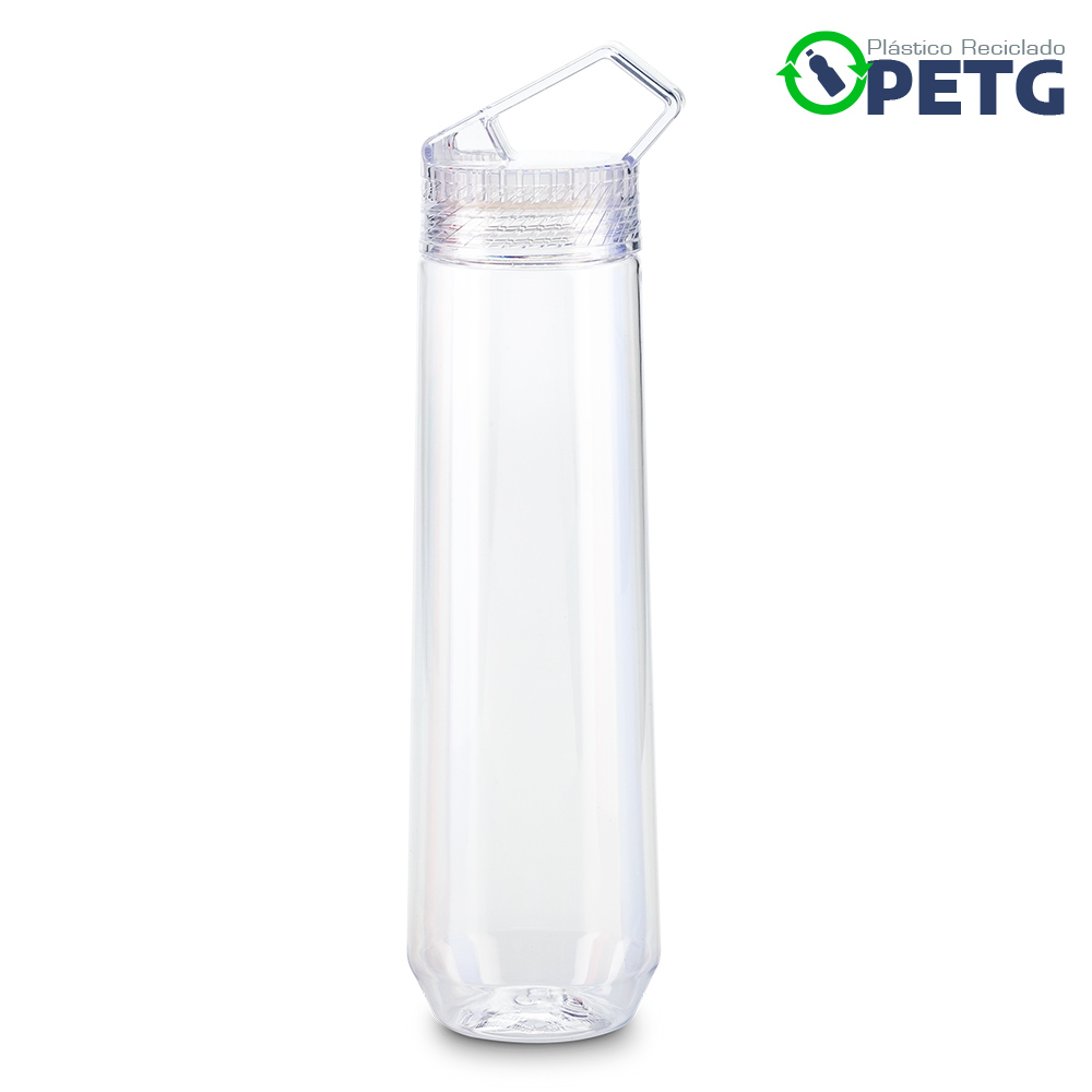 Elaborado en plástico reciclado PETG. Material de alta transparencia, mayor firmeza y durabilidad, libre de BPA, resistente al desgaste e impactos menores y reciclable. Mantiene líquidos tibios hasta 60°C. Tapa de rosca.