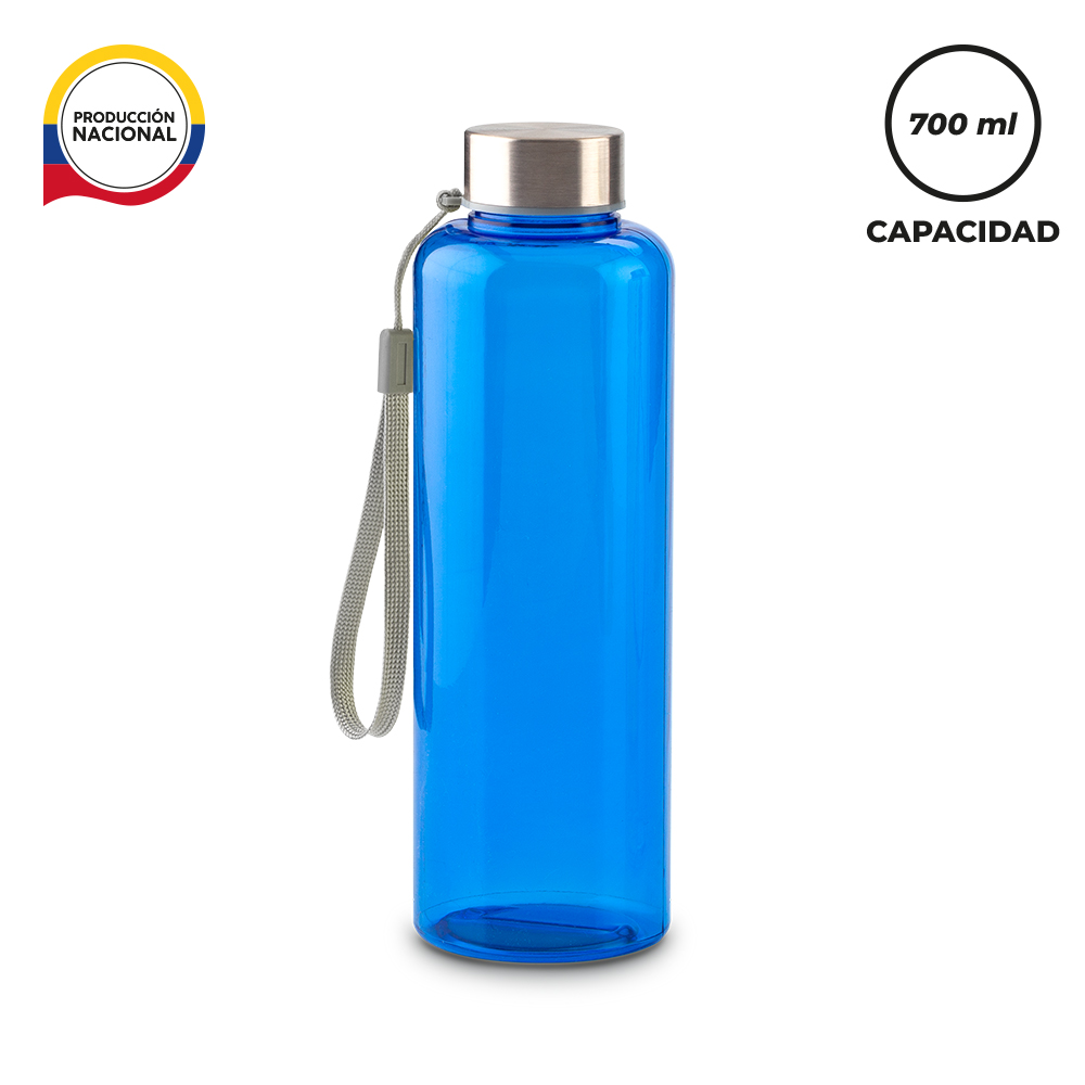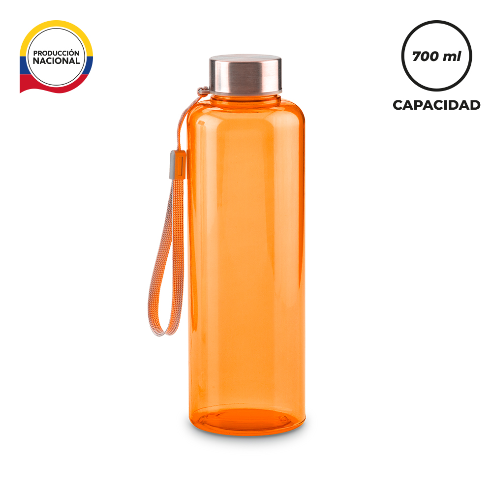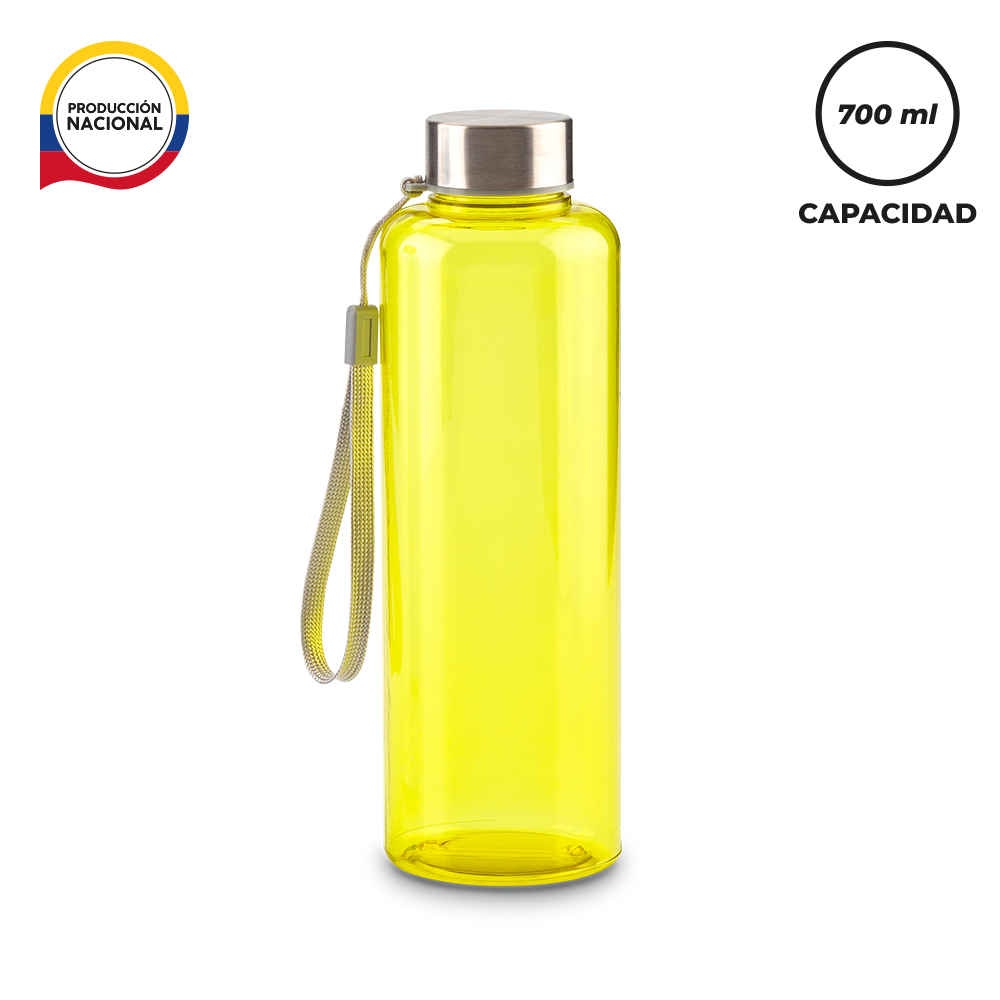 Botilito en plástico PVC de producción nacional. Tapa metálica importada y correa en poliéster. Medidas: 22 cm x 7 cm de diámetro. Marca: 3.5 cm / Tampografía.
