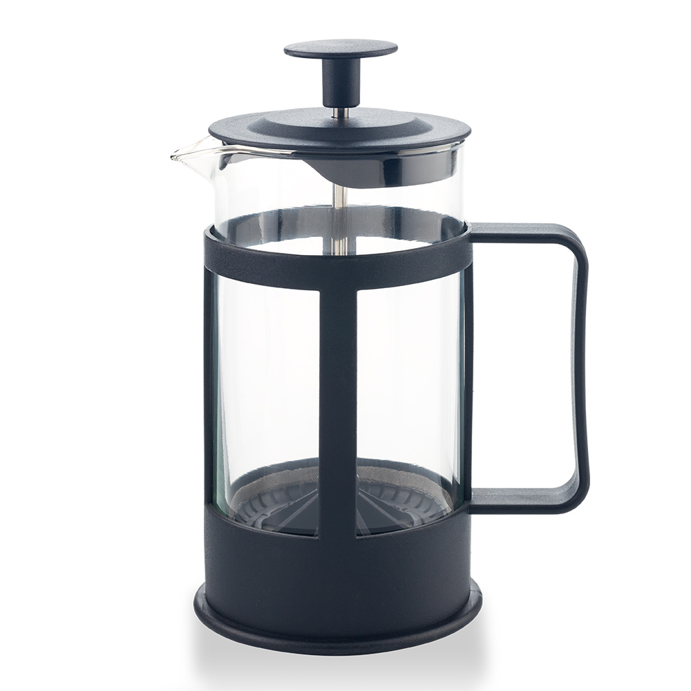 Cafetera Prensa Francesa con filtro de aluminio. Vidrio de Borosilicato. Capacidad 350 ml. Empaque caja individual.