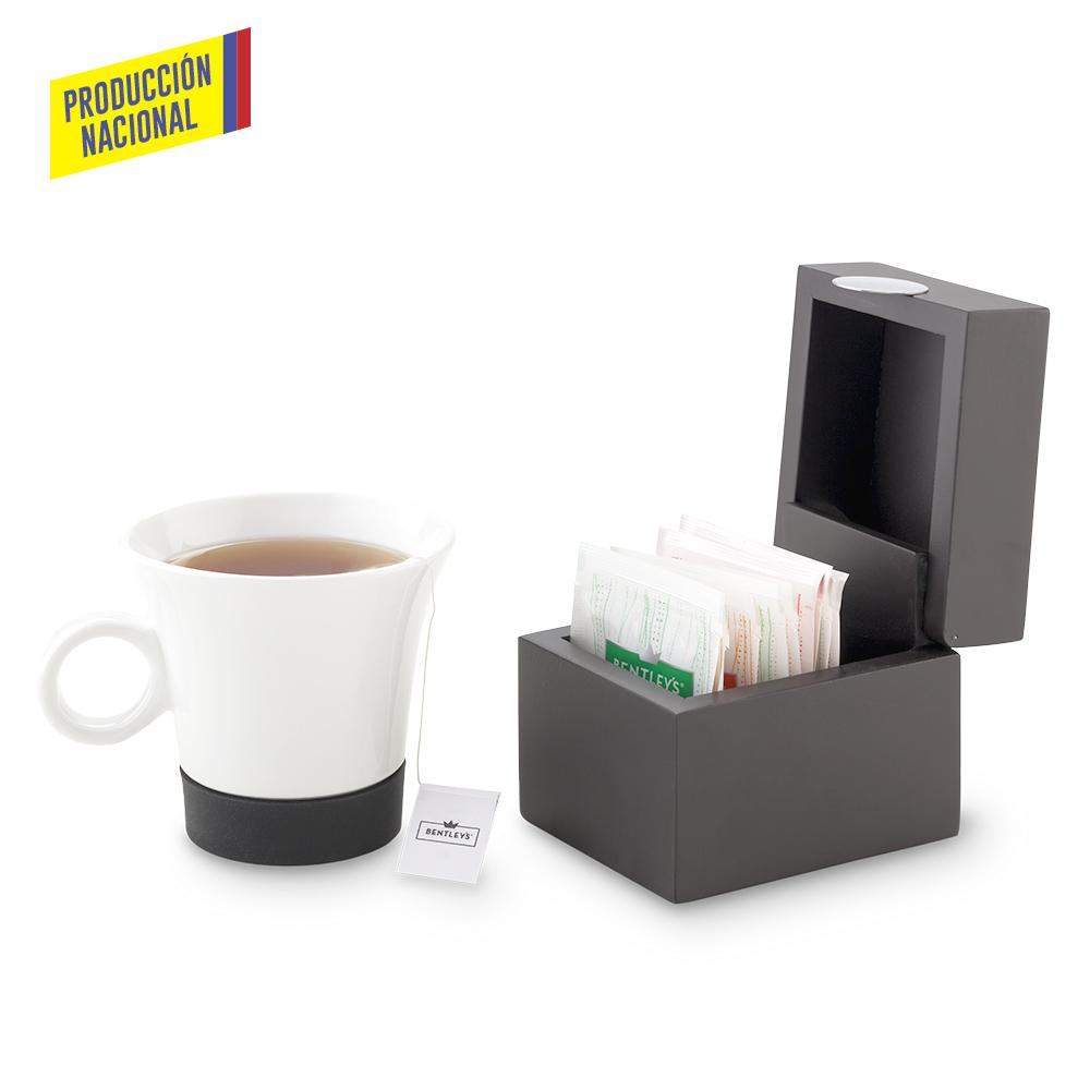 contiene espacios separados para introducir sobres de azúcar y té. (No incluye sobres). Empaque Caja Individual.