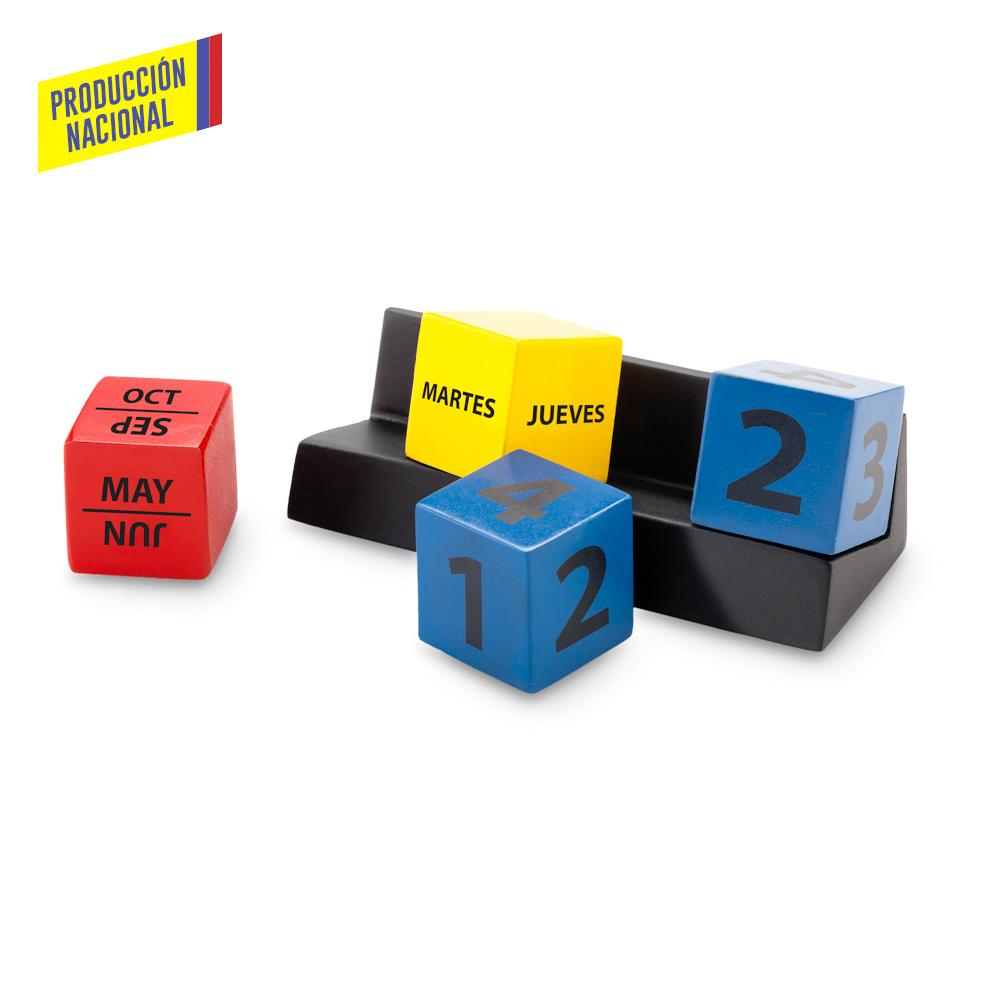 Base elaborada en MDF, con pintura catalizada, incluye 4 cubos (1 amarillo, 1 rojo y 2 azules) con dias de la semana, meses y con numero del dia. Empaque caja Individual.