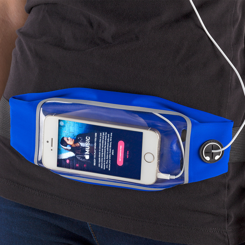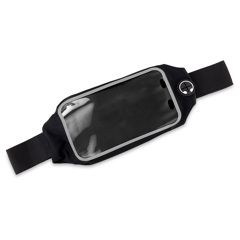 Canguro en nylon, con ventana plástica, reflectivo y salida para audífonos. Medidas: 24 cm x 10.5 cm – Ventana: 16 cm x 8.5 cm Marca: 10 cm / Screen