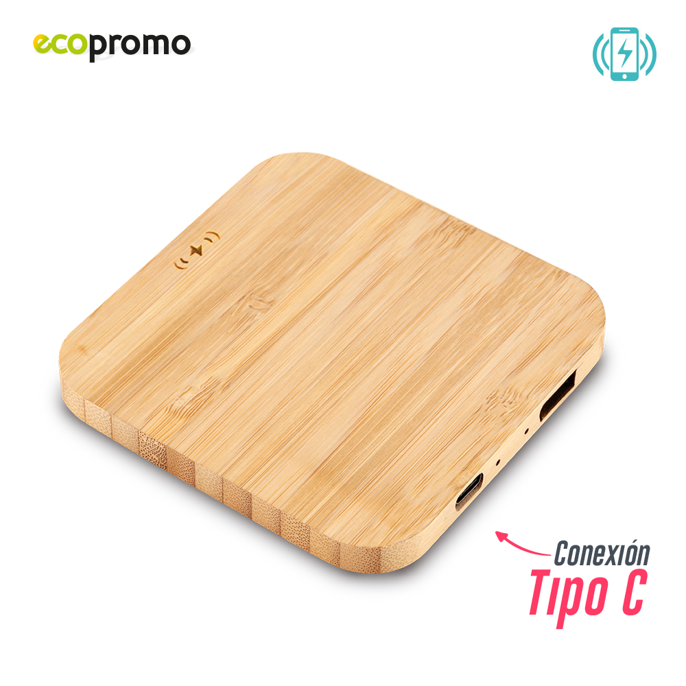 Cargador inalámbrico en bambú de 5W, entrada USB Tipo A y entrada Tipo C. Input: 5V/3A, Output:5V/1A. Empaque Caja Individual. Medidas:9.3 cm x 9.3 cm x 1 cm Marca:3 cm / Láser