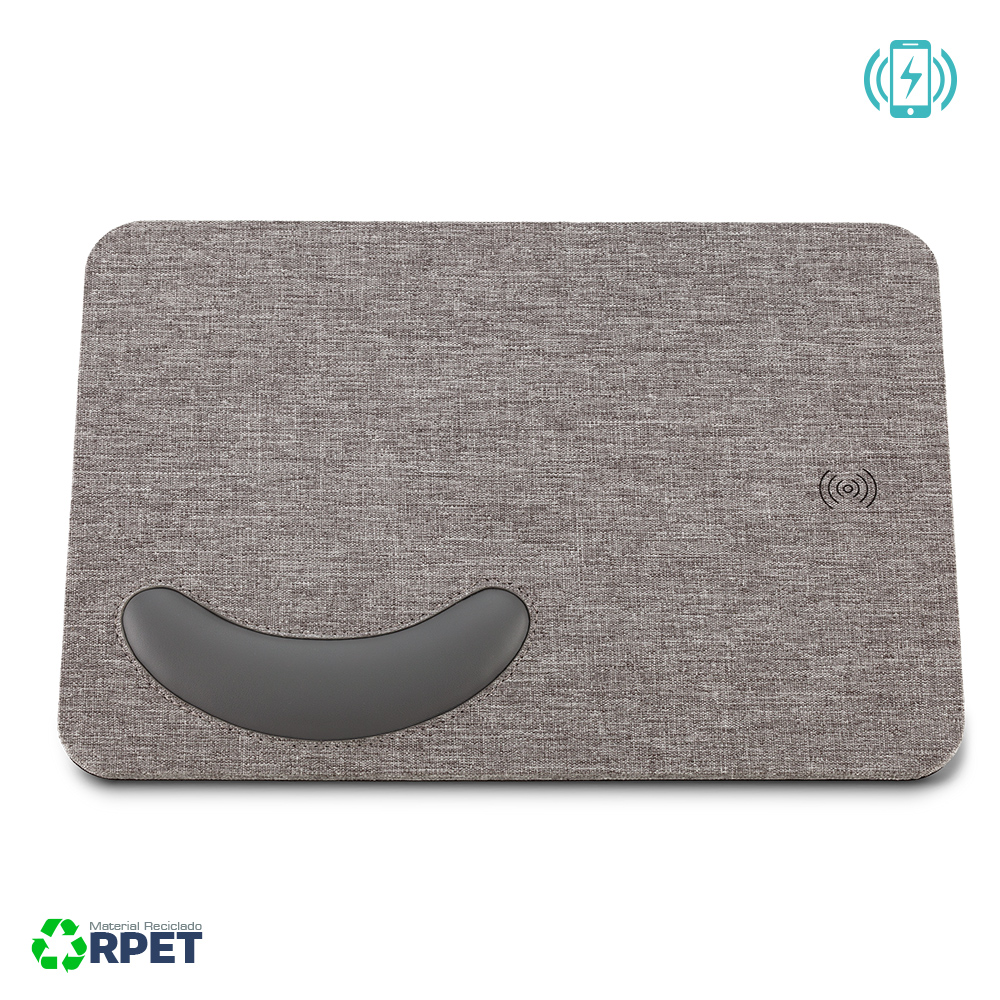 Cargador inalámbrico para móviles en poliéster reciclado RPET con mouse pad y apoya muñecas ergonómico acolchado.