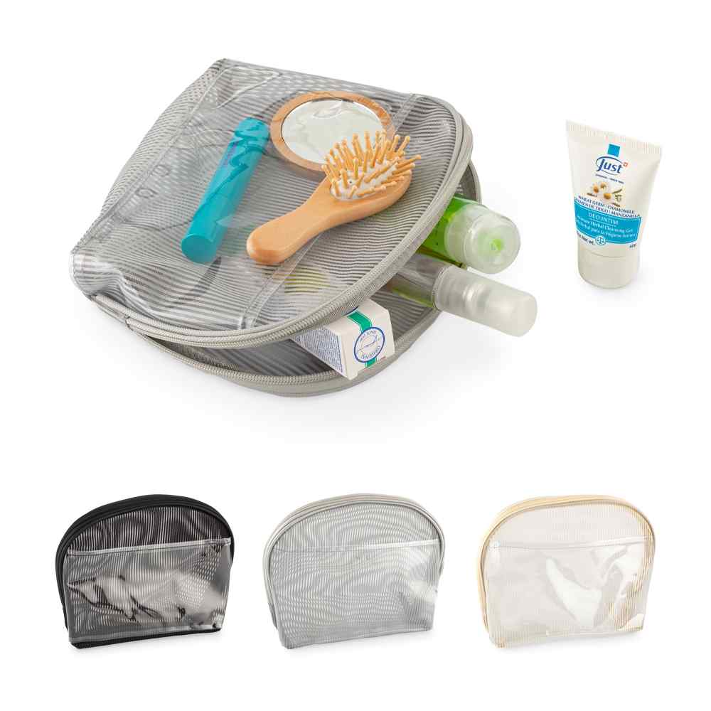 Cosmetiquera en poliéster con un bolsillo externo en PVC. Medidas: 19 cm x 17 cm x 9 cm. Marca: 8 cm / Screen / Tampografía.