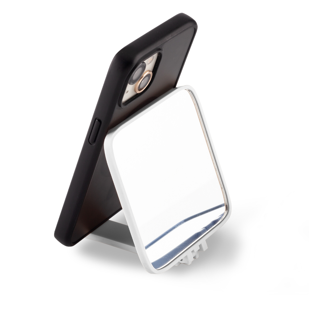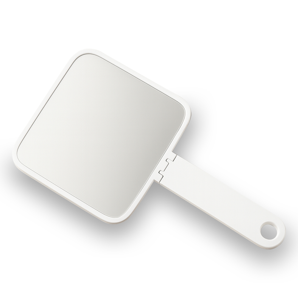Espejo plástico con mango plegable. Medidas: 9 cm x 9 cm. Marca: 4 cm / Tampografía.