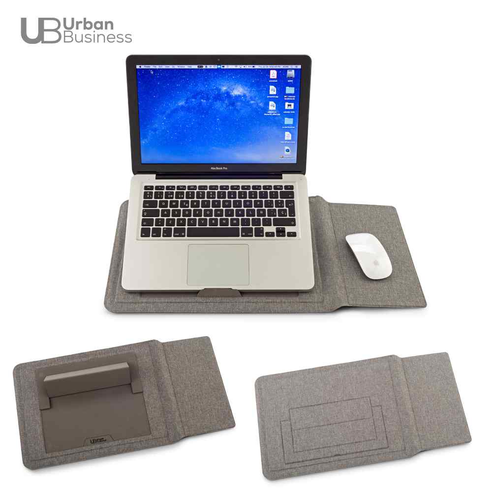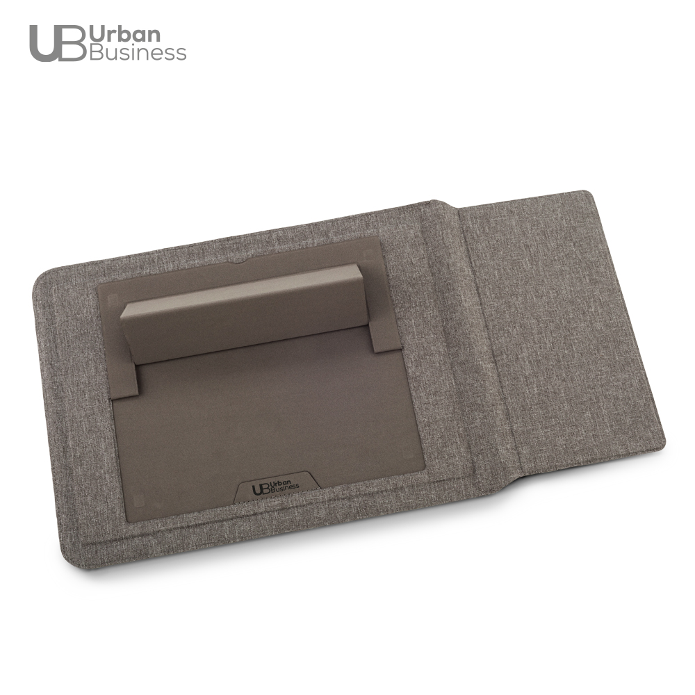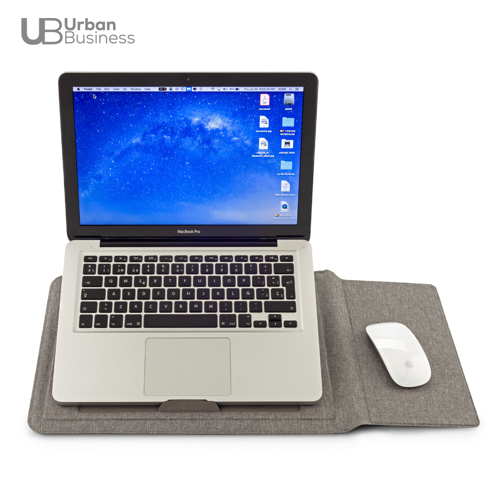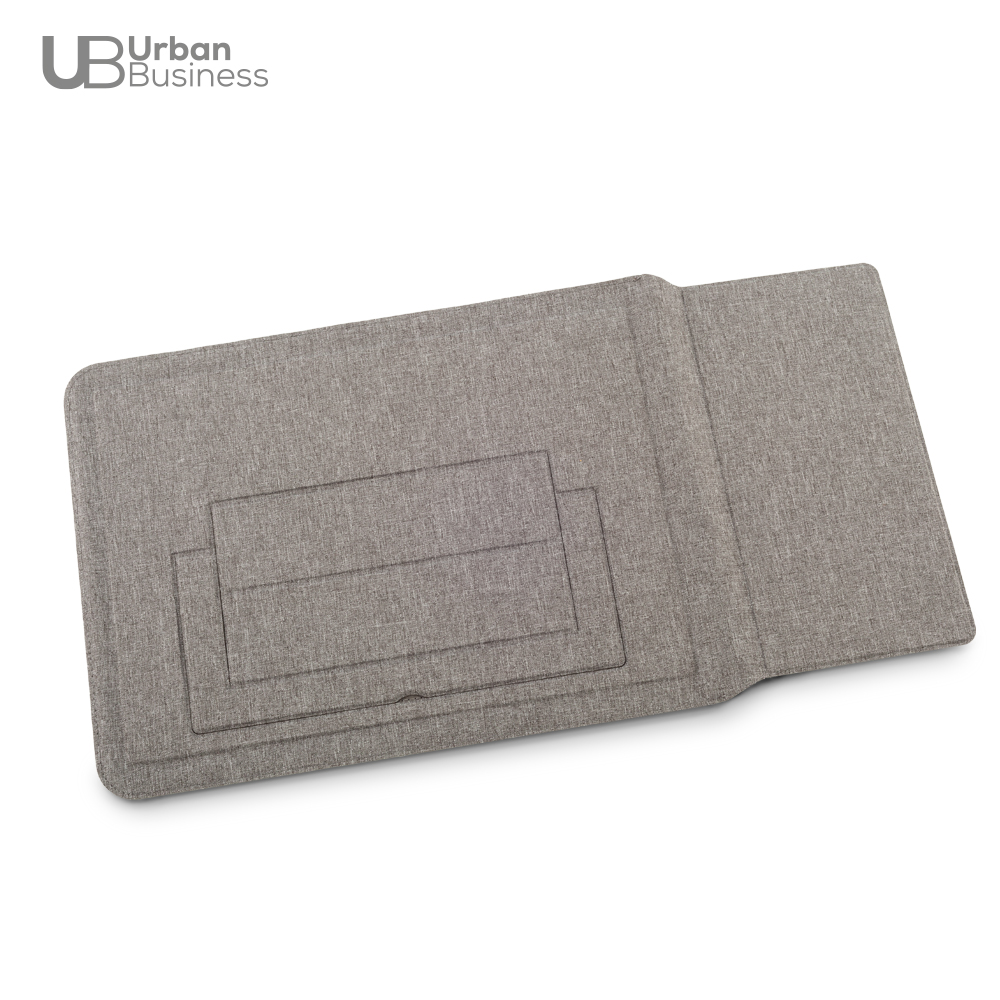 Soporte multiusos para trabajo en poliéster reciclado RPET. Tiene un soporte plegable el cuál se ajusta máximo a computadores de 16”, la solapa funciona cómo mouse pad y tiene un compartimiento para documentos. Empaque caja individual.