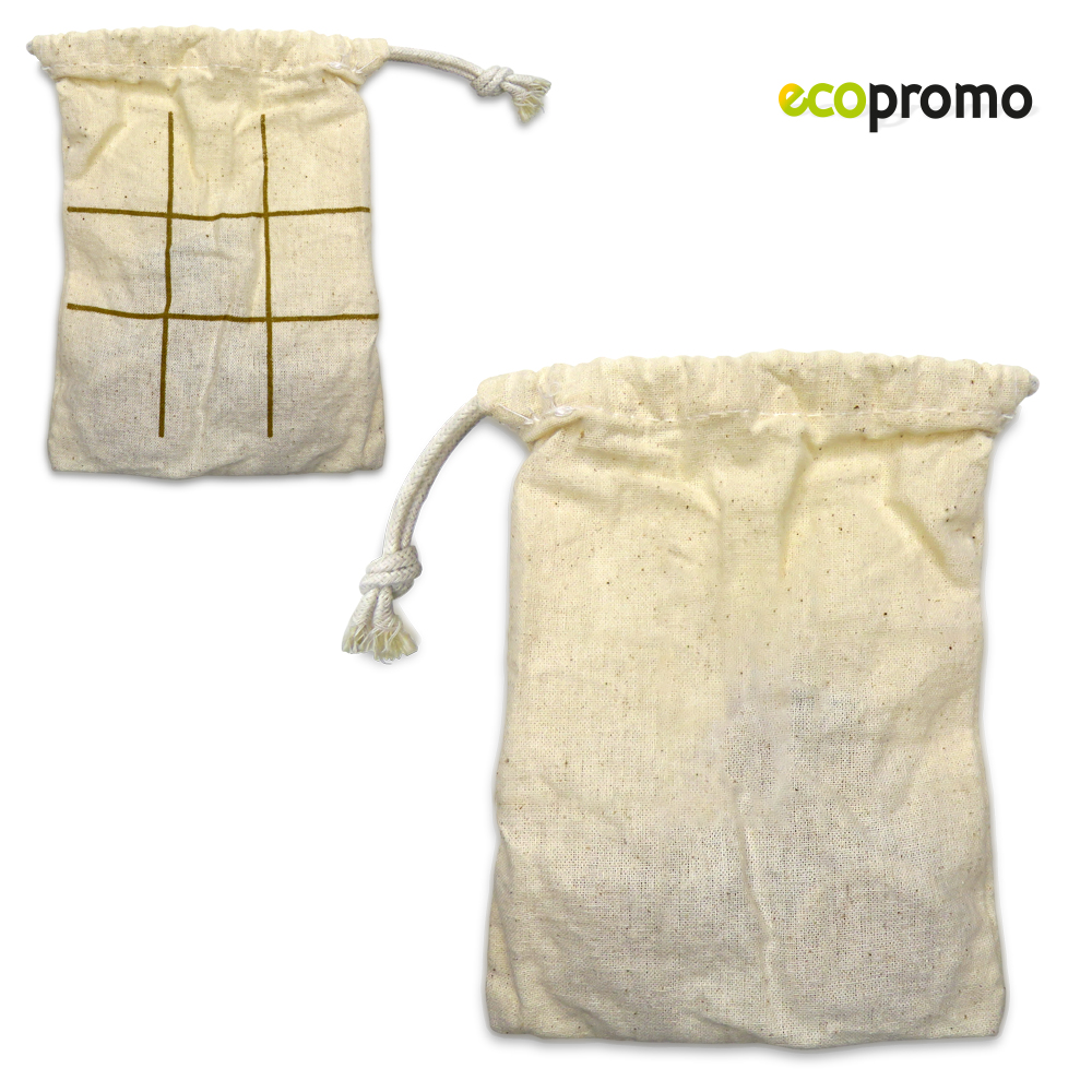 Juego triqui fabricado en corcho natural con 5 fichas circulares y 5 fichas en cruz. En bolsa de algodón con cierre de cordón que sirve como tablero para jugar.