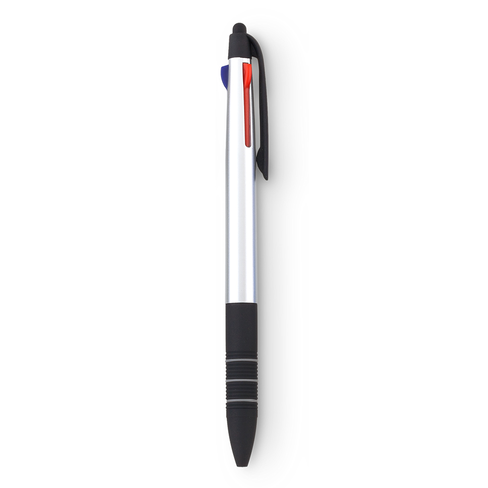Bolígrafo plástico con stylus y tres minas: azul, rojo, negro. Medidas: 14.8 cm Marca: 2.5 cm / Tampografía
