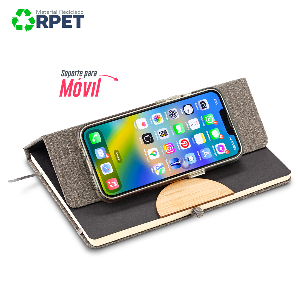 Libreta con soporte para telefono, tapa dura en RPET tamaño A5 con adorno de bambú, 80 hojas interiores rayadas de 70 g/m². Medidas: 21.3 cm x 14.6 cm Marca: 5.5 cm / Tampografía / 3 cm / Láser