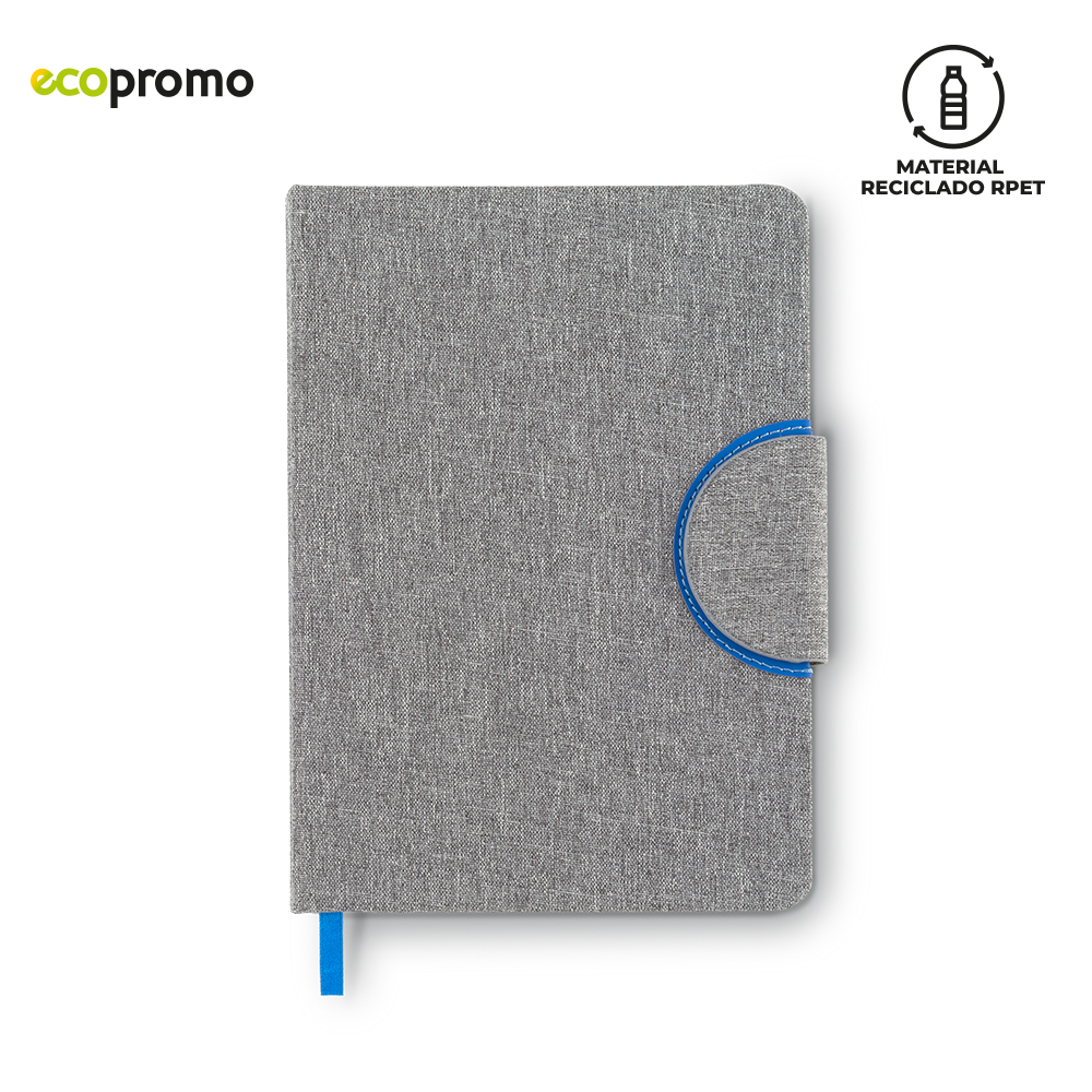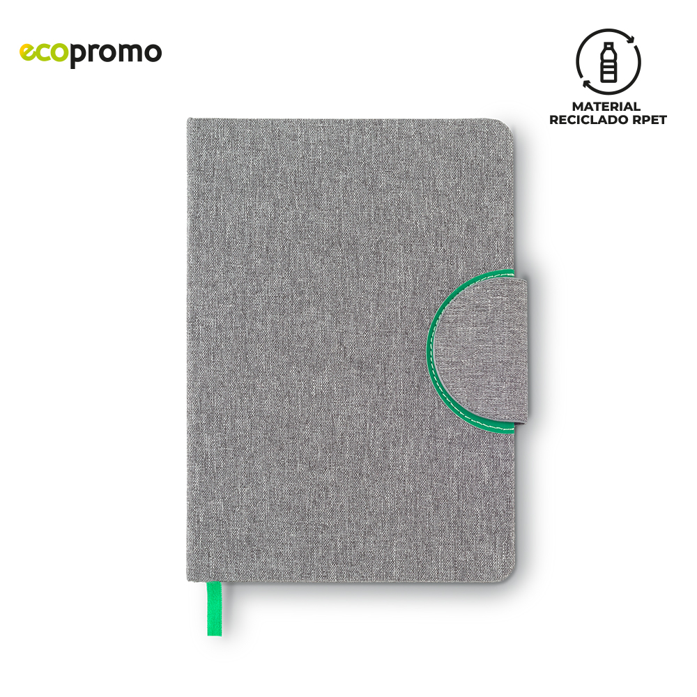 Libreta en poliéster reciclado RPET y cierre con imán. 80 hojas rayadas.