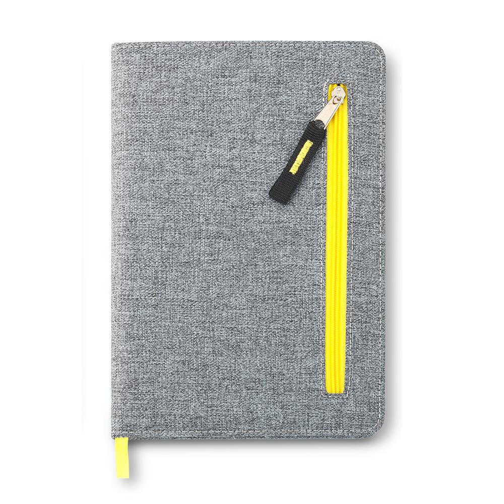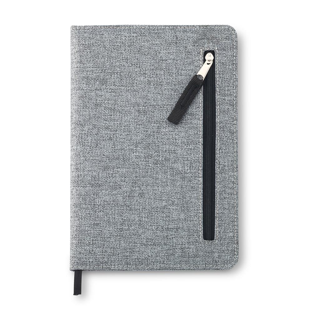 Cubierta en tela y bolsillo frontal con cremallera. 80 hojas con rayas.