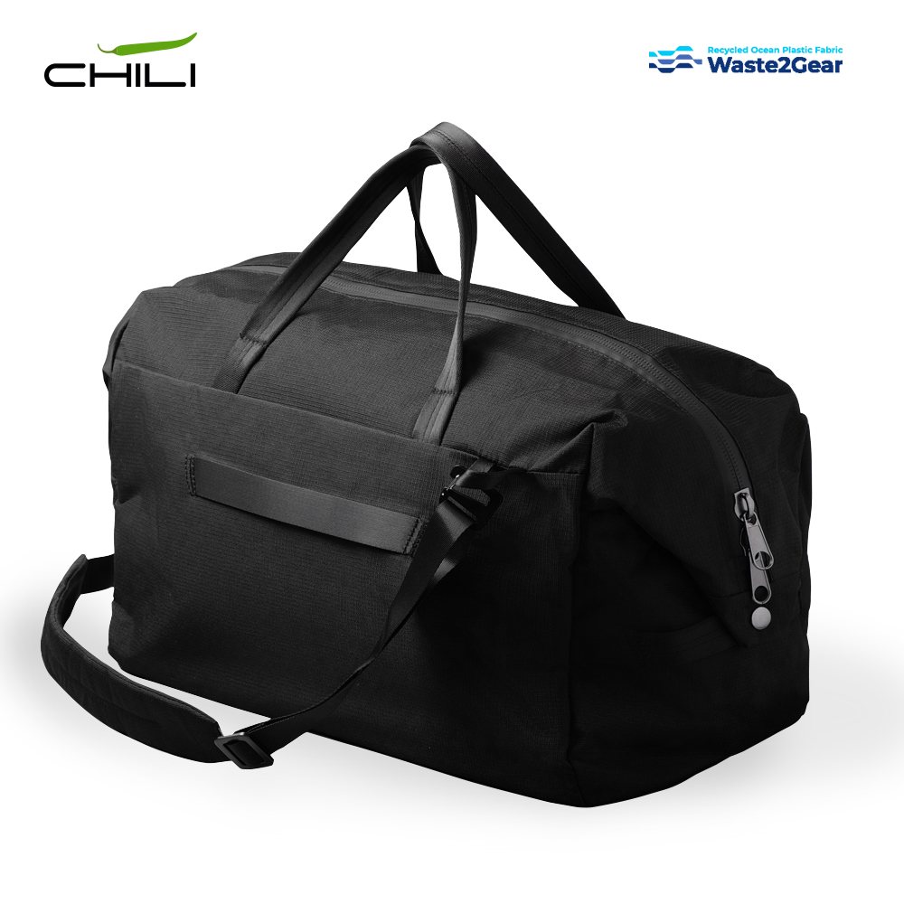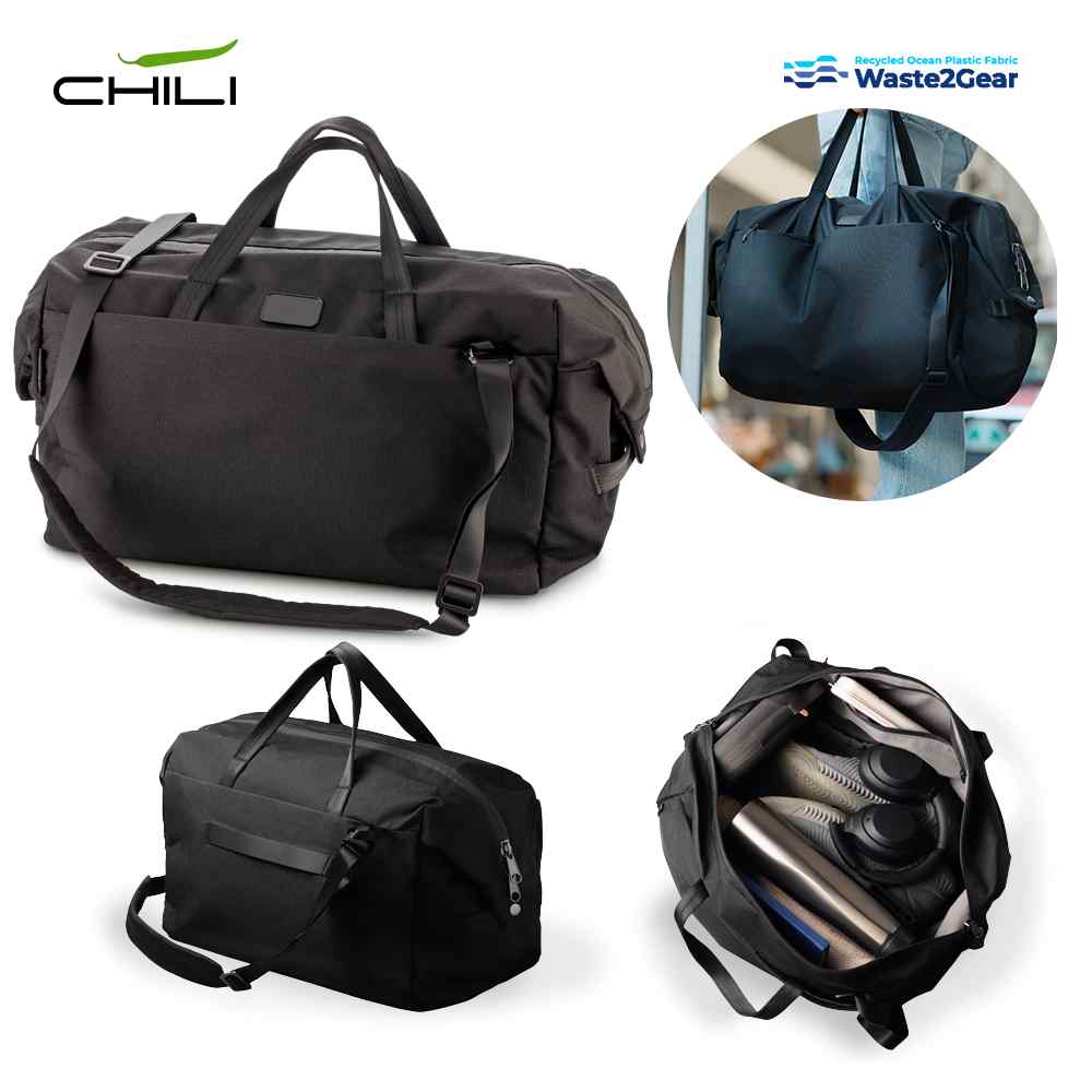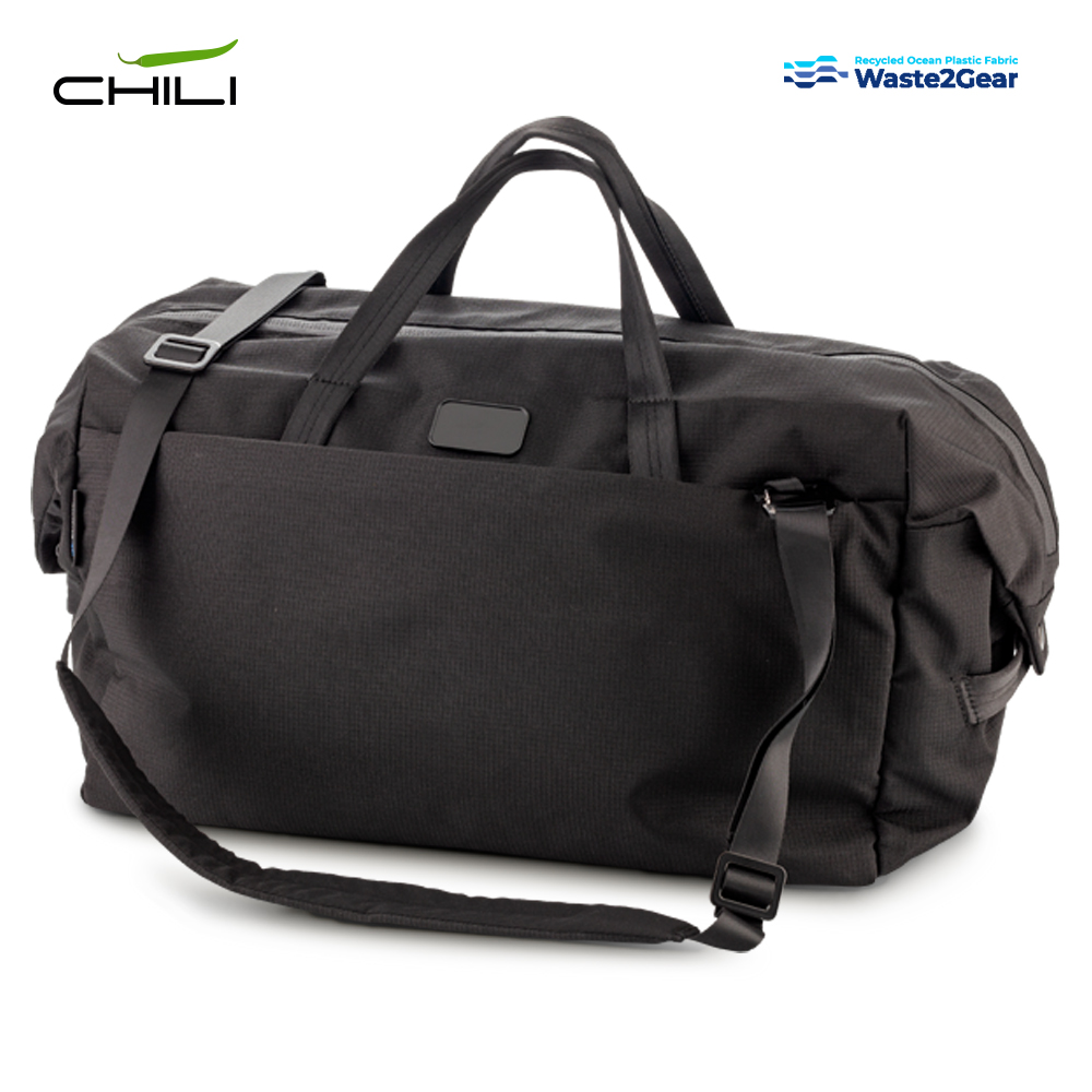 Maletín en poliéster reciclado de residuos plásticos recuperados del océano. Dos compartimentos con cierre de cremallera. Incluye placa metálica para marcar. Medidas: 52 cm x 32 cm x 22 cm . Marca: 3 cm Láser/ 10 cm Screen