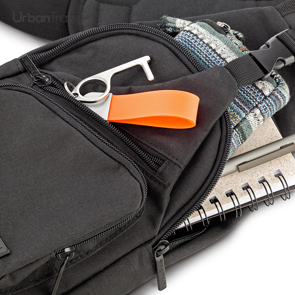 Bolso compacto manos libres en poliéster, tres bolsillos con cremallera, un bolsillo sin cremallera.