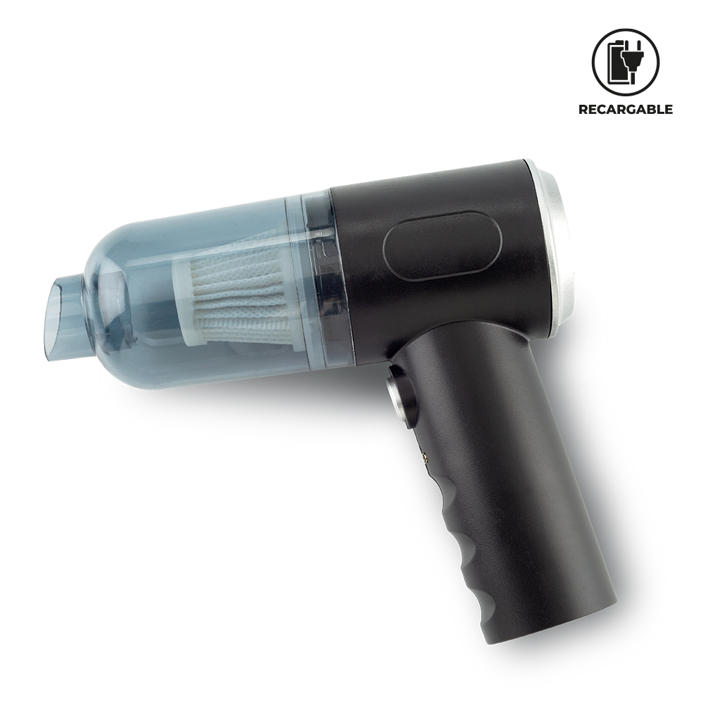 Mini aspiradora portátil 3 en 1. Incluye 3 accesorios. Funciona para limpiar teclados, objetos pequeños y carro. Recargable. Empaque caja individual. Medidas caja: 16 cm x 13 cm x 6 cm. Marca: 2.5 cm / Tampografía.