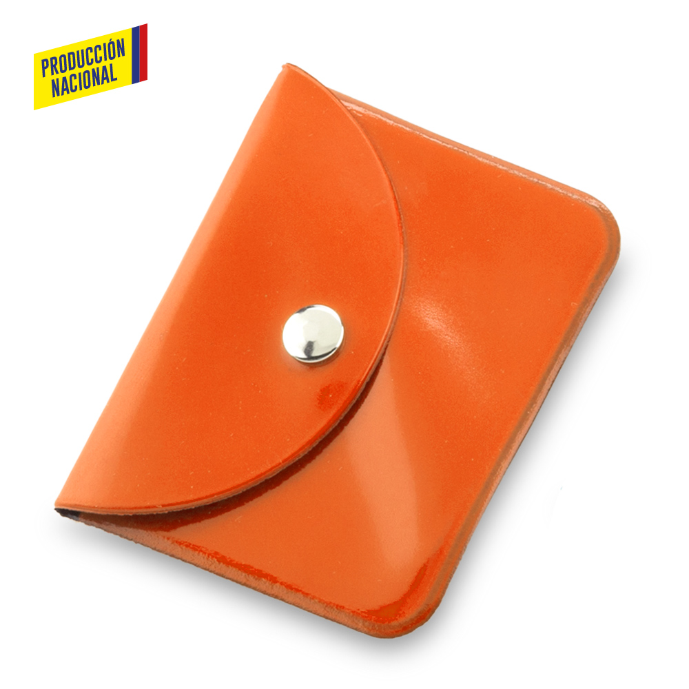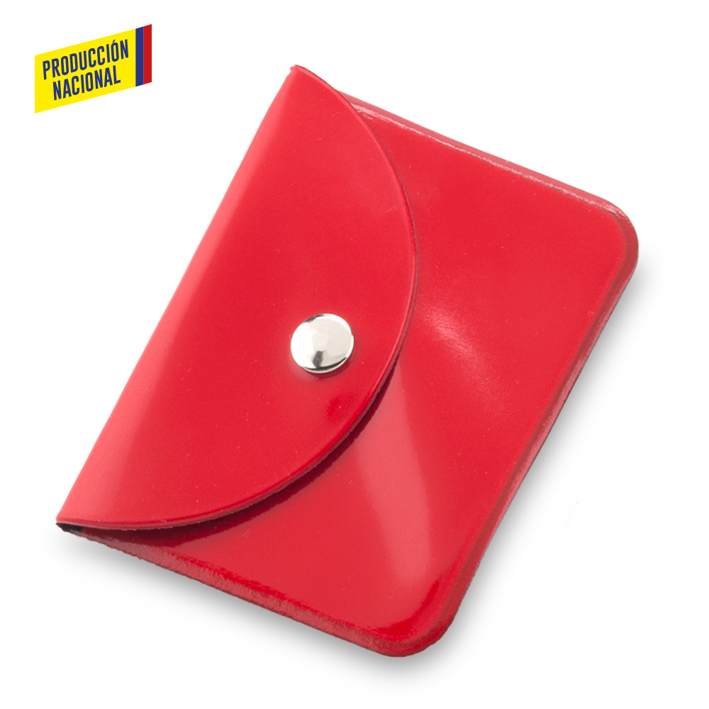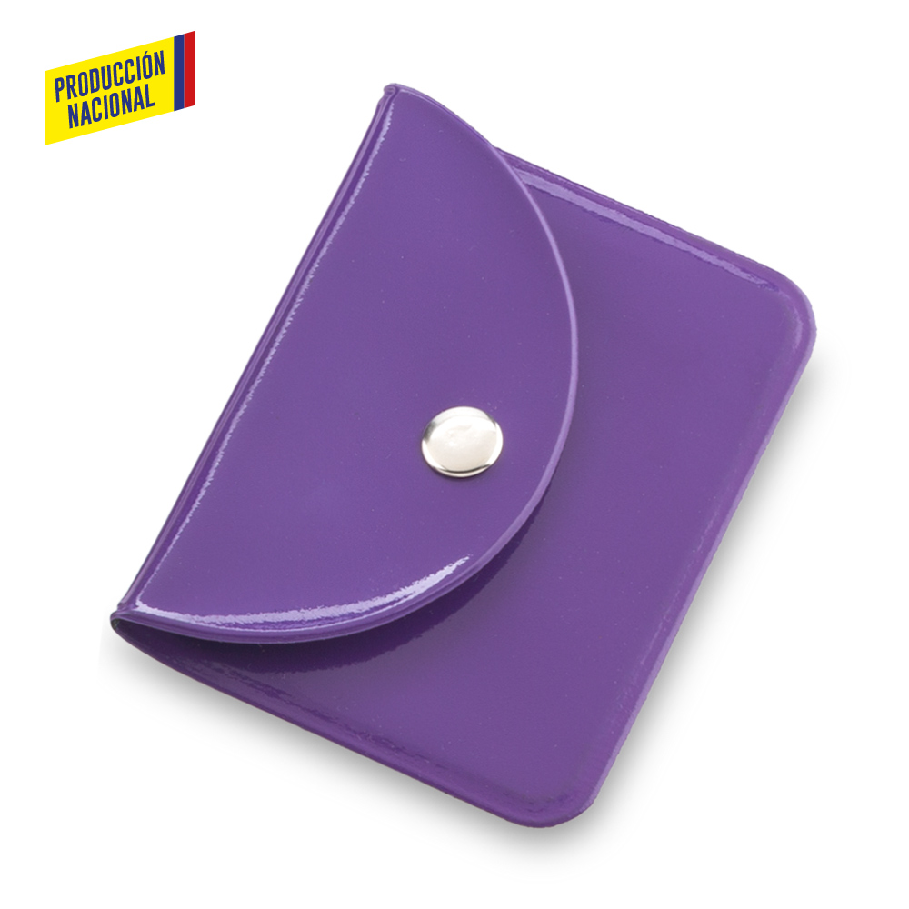 En P.V.C. con acabado brillante, cierre de broche metálico. Medidas: 8.2 cm x 6.8 cm Marca: 2.5 cm x 1.5 cm / Tampografía / Screen