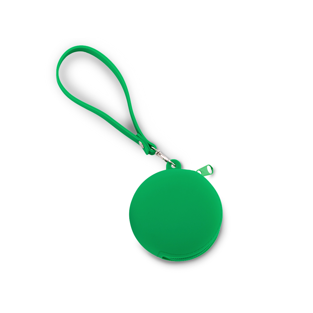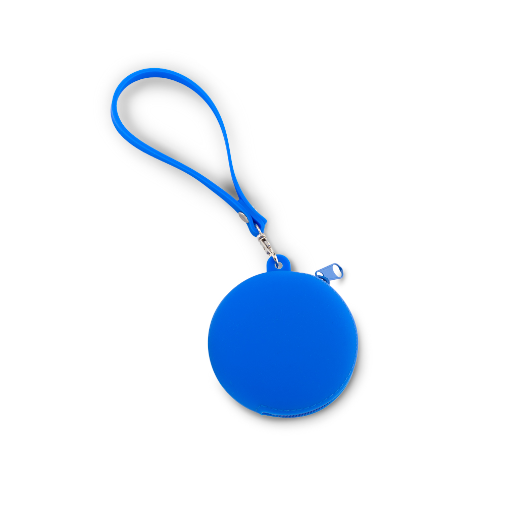 Monedero en silicona flexible. Con accesorio en silicona para poderlo cargar. Medidas: 8.5 cm x 8 cm x 2 cm. Marca: 3 cm / Tampografía en silicona a una tinta.