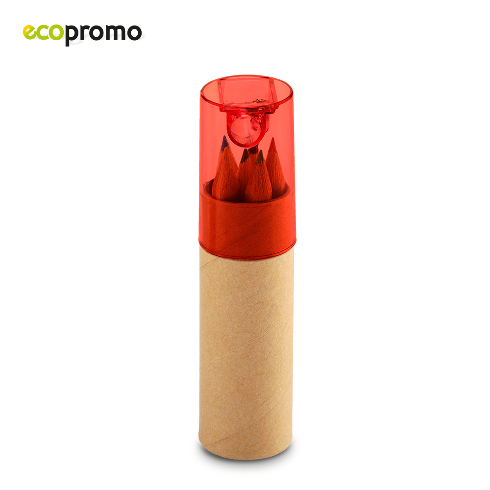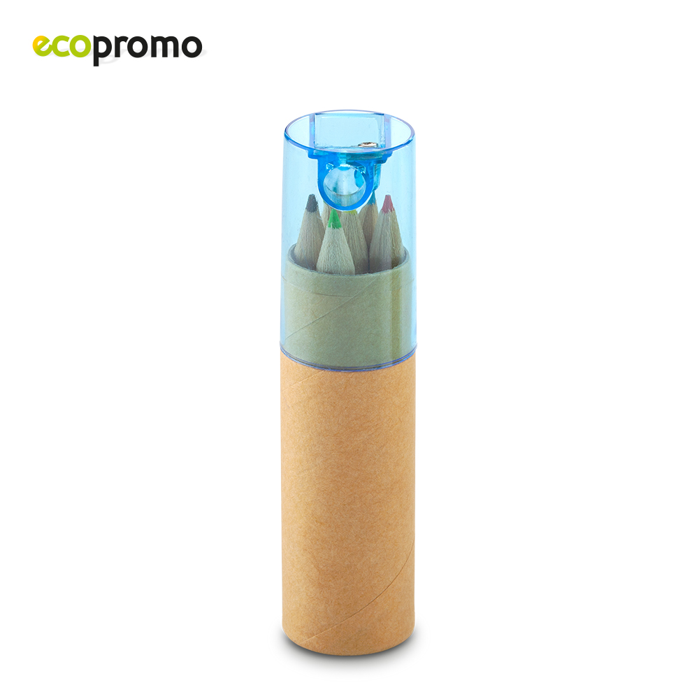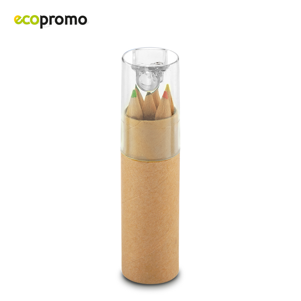Mini estuche de cartón con 6 colores y tajalápiz plástico. Medidas: 10.5 cm x 2.5 cm diámetro Marca: 3 cm Screen / 1.5 cm Tampografía
