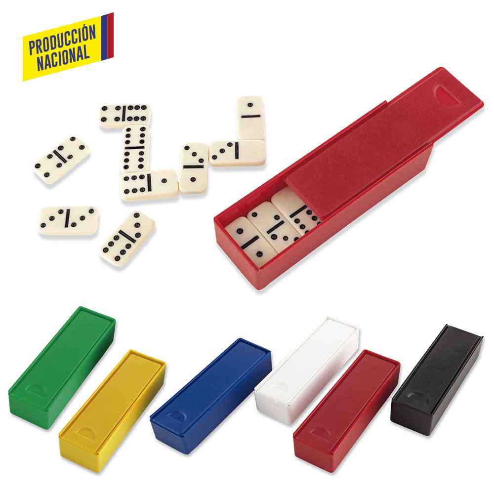 Dominó importado en estuche plástico con tapa corrediza. Medidas: 11.5 cm x 3.5 cm x 2.5 cm Marca: 4.5 cm / Tampografía