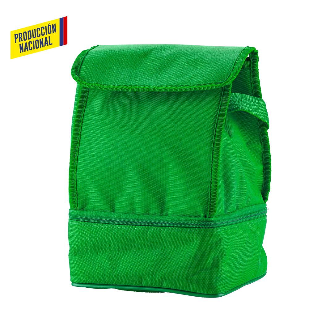En lona poliéster. Cierre en velcro, manija en reata y bolsillo portacomida.