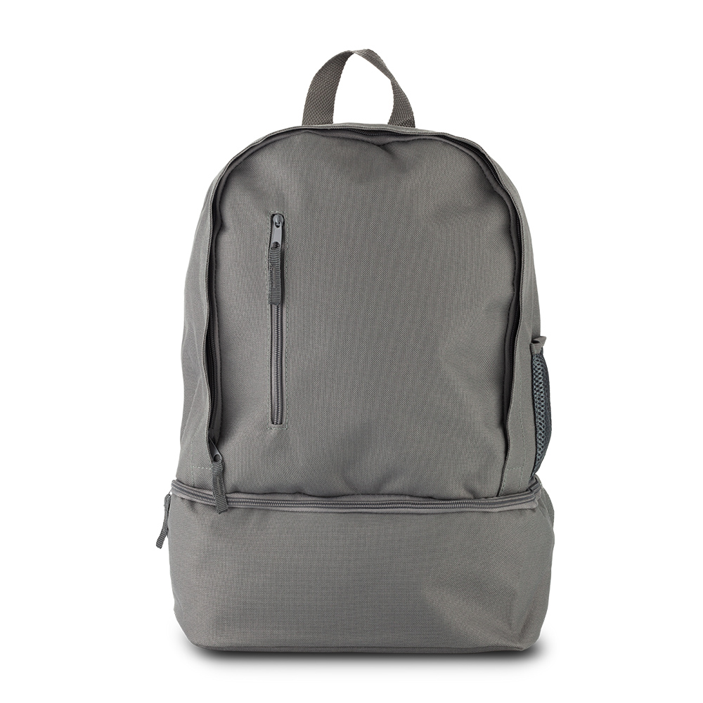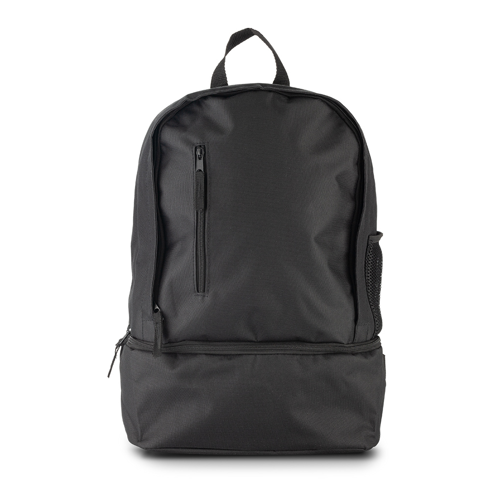 Morral en poliéster, con bolsillo frontal con cremalleray bolsillo lateral en malla portabotella. Con bolsillo guarda zapatos.