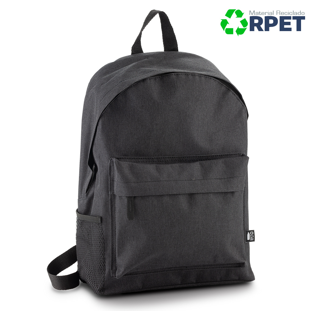 Morral elaborado en poliéster reciclado (PET reciclado de botellas de agua), un compartimento y un bolsillo exterior. Una malla lateral.