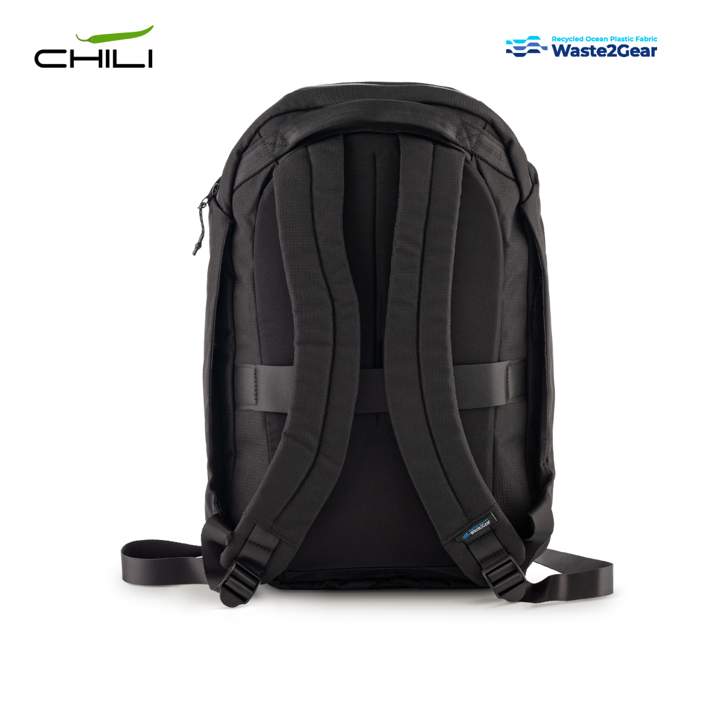 Morral en poliéster reciclado de residuos plásticos recuperados del océano. Seis compartimentos con cierre de cremallera. Incluye placa metálica para marcar. Medidas: 47 cm x 36 cm x 12 cm . Marca: 3 cm Láser/ 10 cm Screen