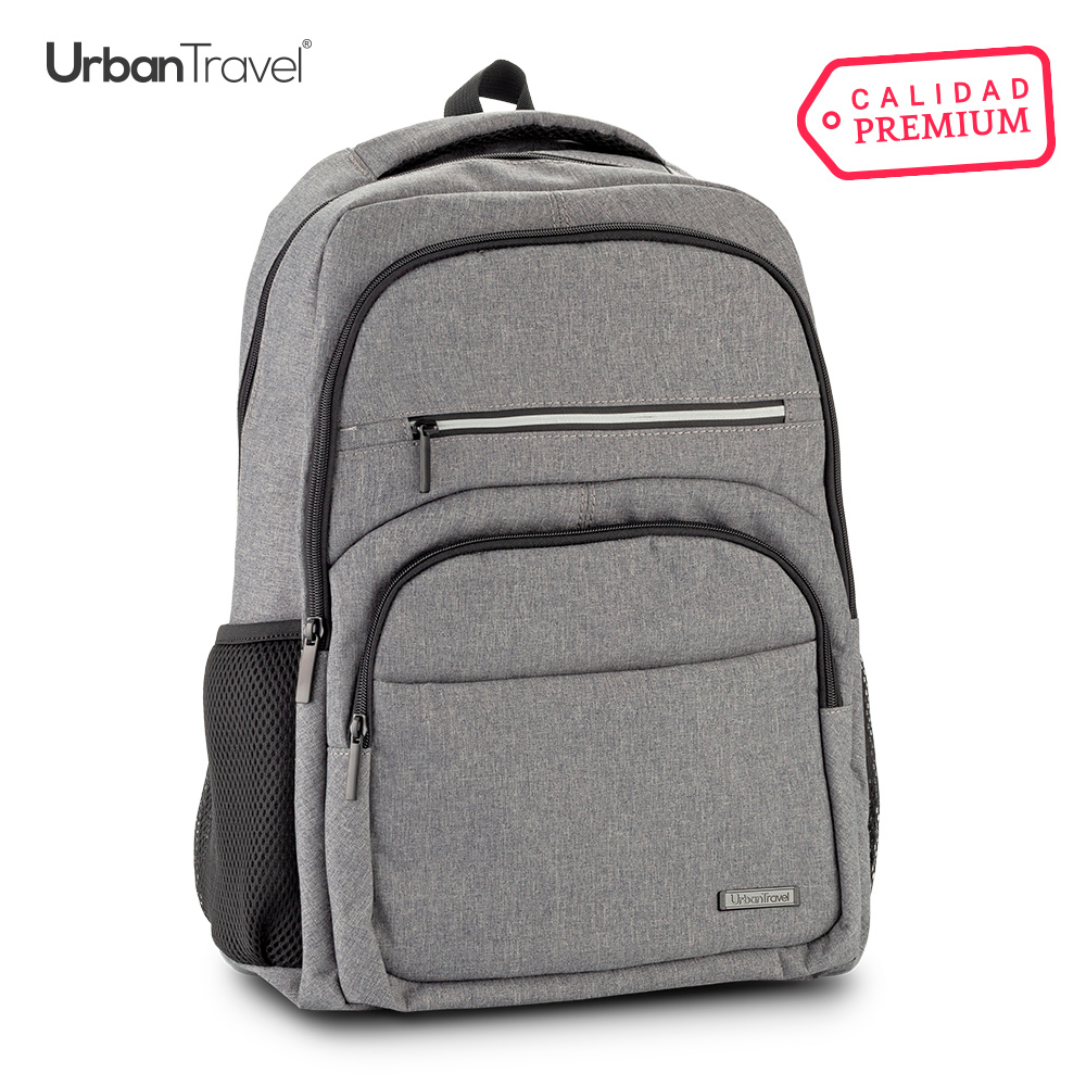 Morral en poliéster para portátil de 15.6”. Tres bolsillos externos. Mallas laterales portabotellas.