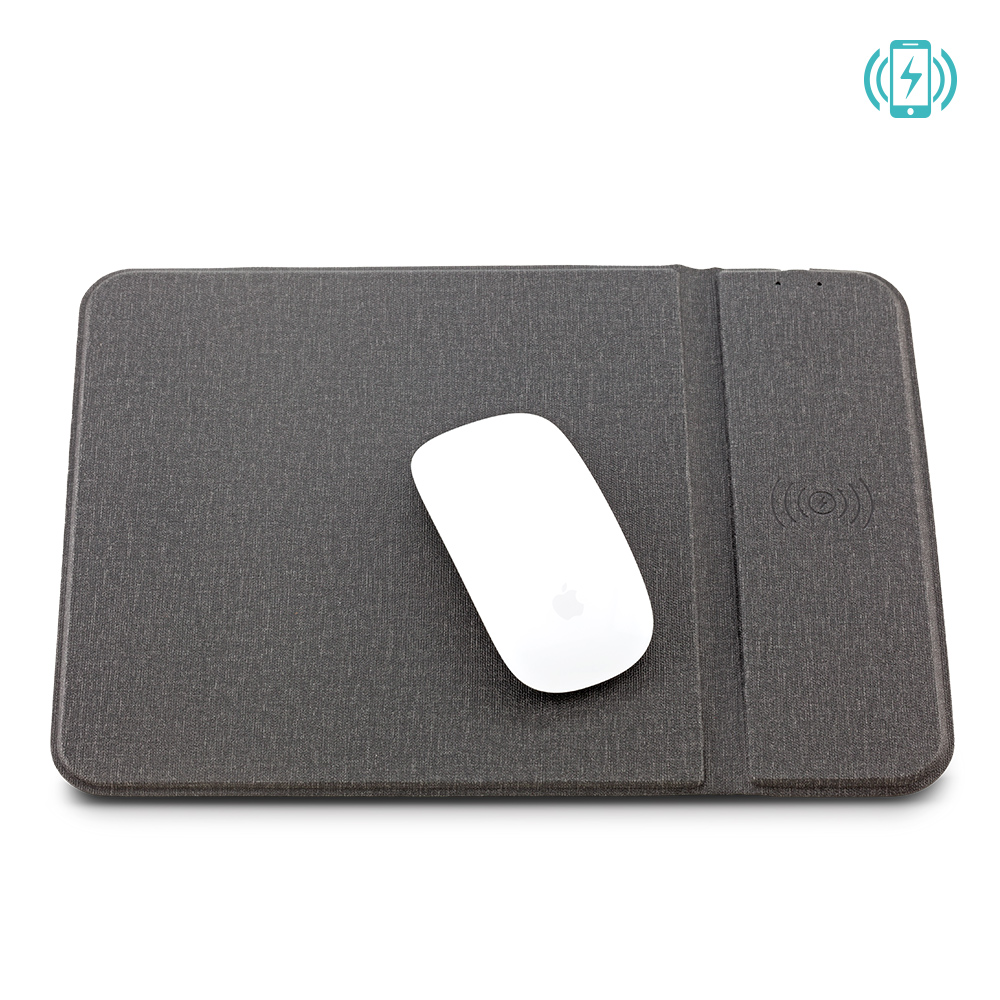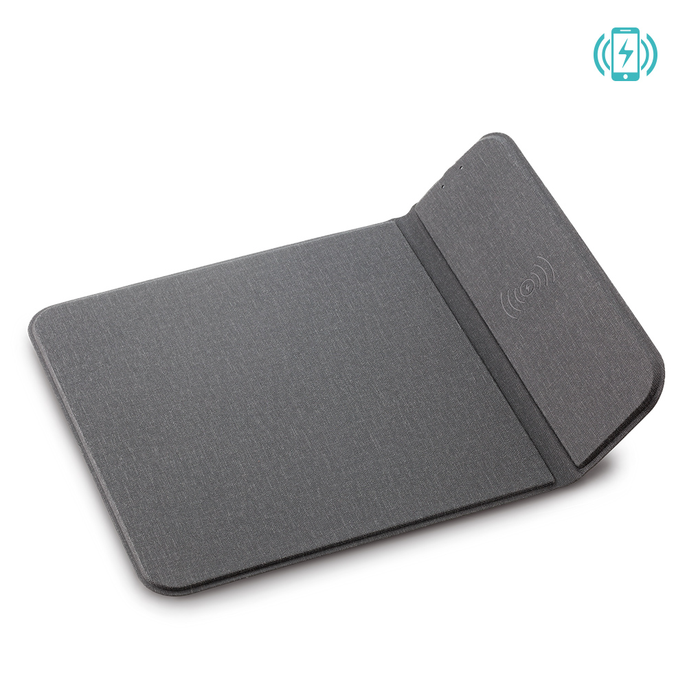 Mouse pad con cargador inalámbrico de 15W y soporte para celular lateral. Empaque Caja Individual.