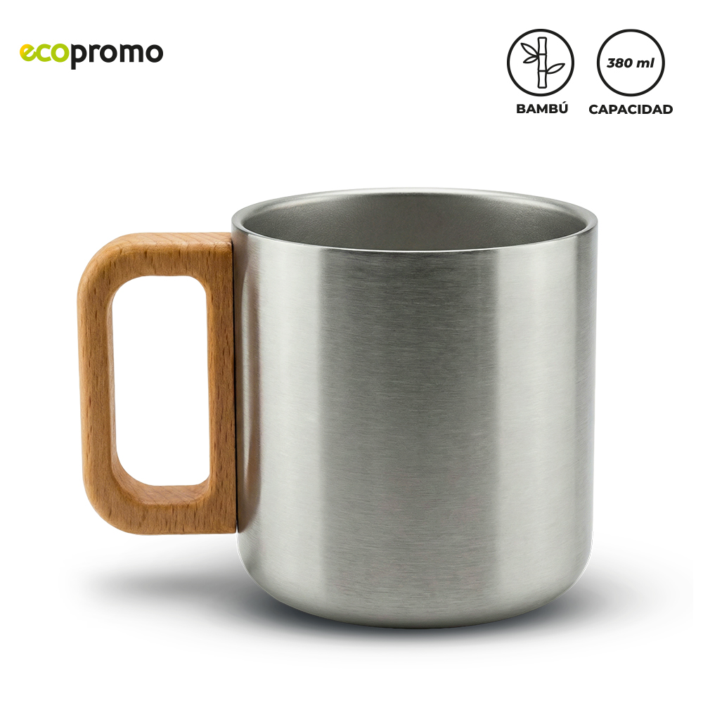 Mug en acero inoxidable doble pared con manija en bambú, el material de fabricación es de textura porosa. Empaque caja individual.