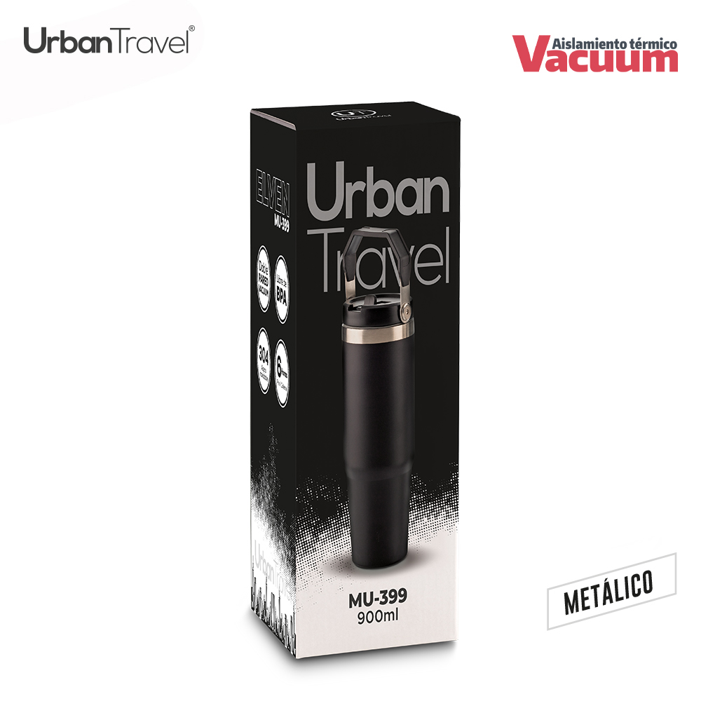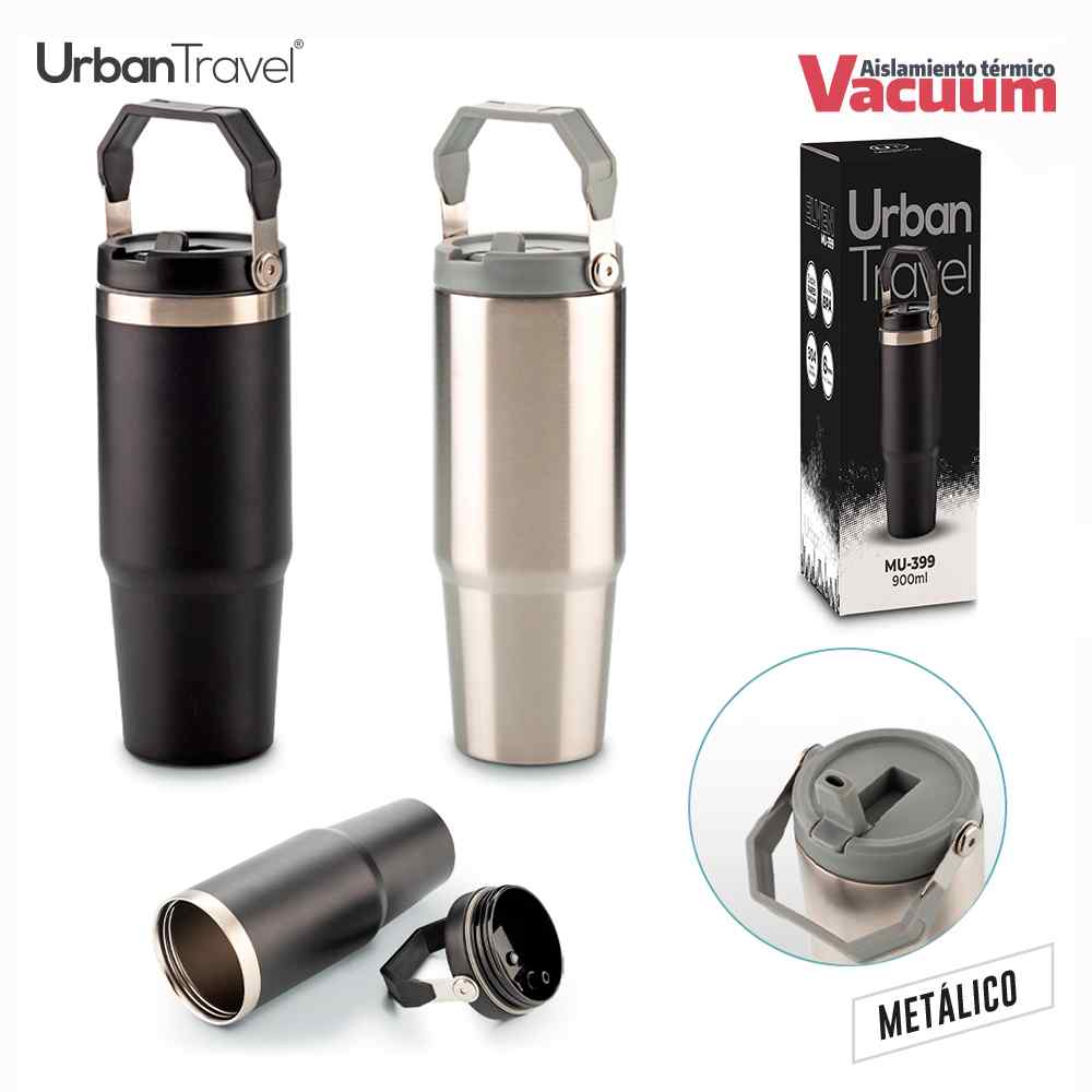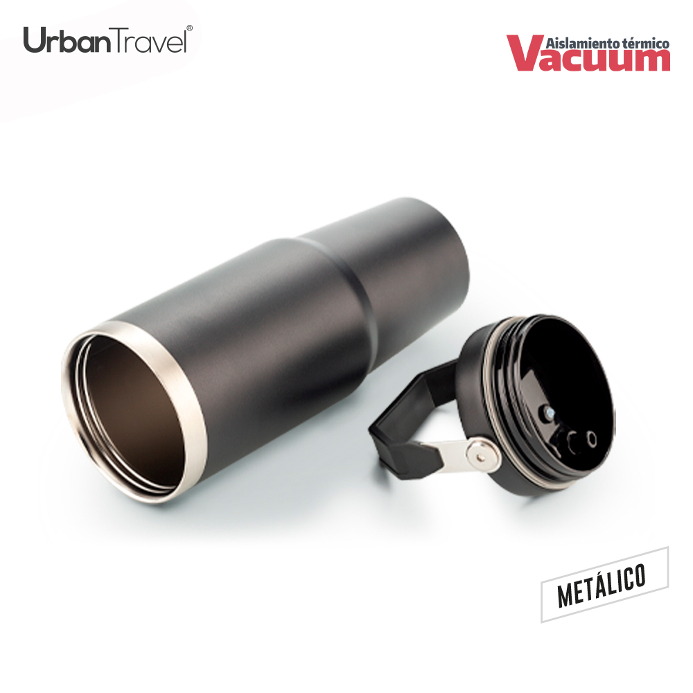 Mug doble pared vacuum en acero inoxidable, con aislamiento térmico que mantiene la bebida fría o caliente hasta 6h, aprox (puede variar dependiendo condiciones climáticas). Con tapa rosca y manija en plástico. Incluye pitillo plástico. Empaque caja individual.