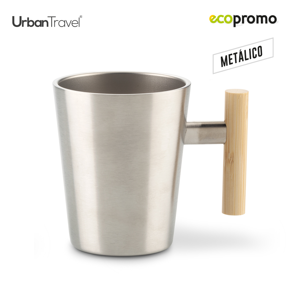 Mug metálico en acero inoxidable doble pared con manija en bambú. Empaque caja individual.