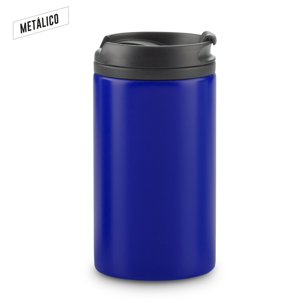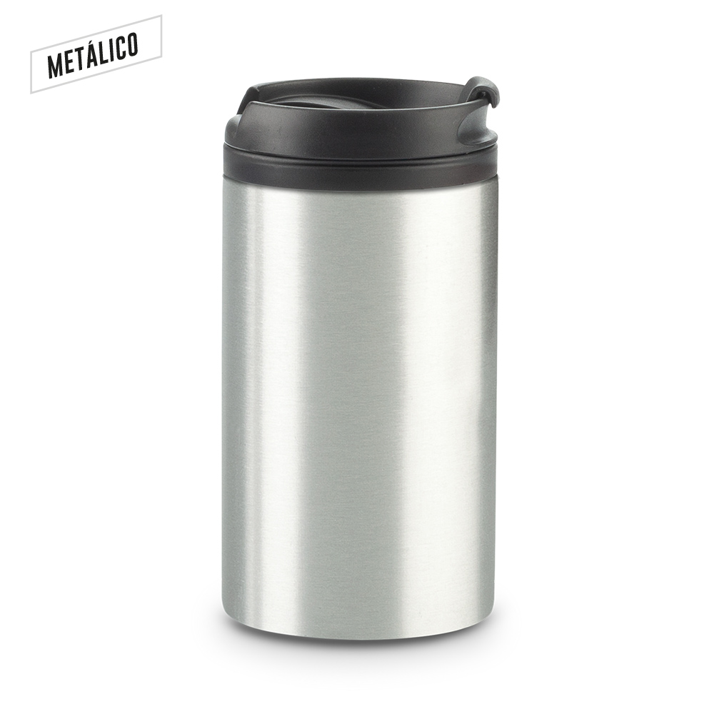 Mug doble pared en acero inoxidable y plástico. Con tapa rosca en plástico. Base antideslizante. La tapa es una tapa protectora de cierre a presión, no es tapa de seguridad. Empaque caja individual.