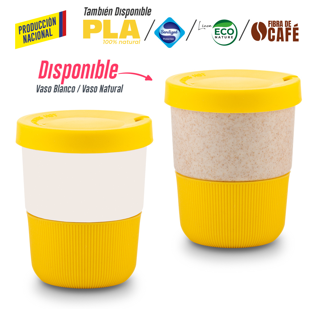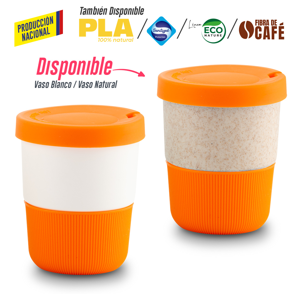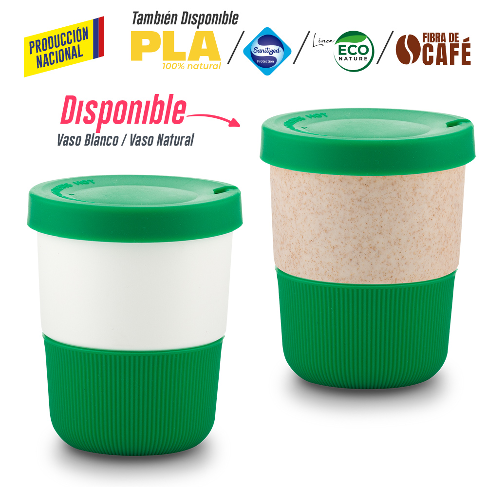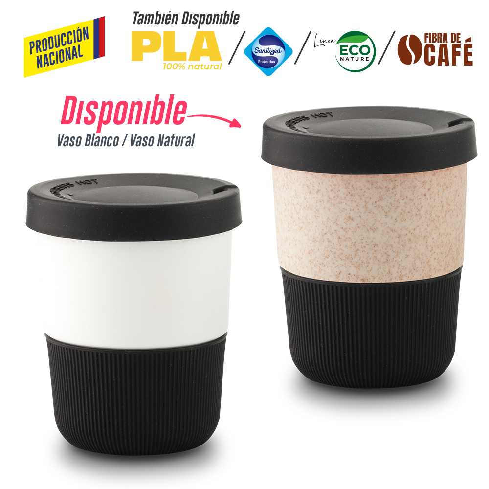 Vaso blanco en polipropileno o vaso natural polipropileno y mezcla con material ecológico en fibra de trigo (50% aprox). El porcentaje de material ecológico tiene un promedio de biodegradabilidad de 2-3 años después del fin de su vida útil. Tapa y base en silicona importada. La tapa es una tapa protectora de cierre a presión, no es tapa de seguridad.