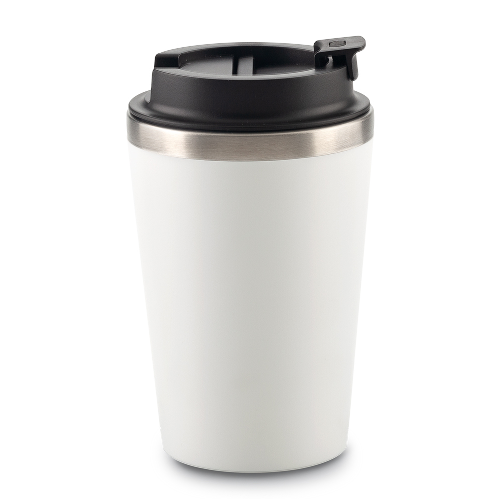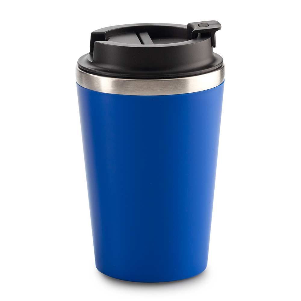 Mug plástico con interior en acero inoxidable. Taparosca de seguridad. Empaque caja individual.