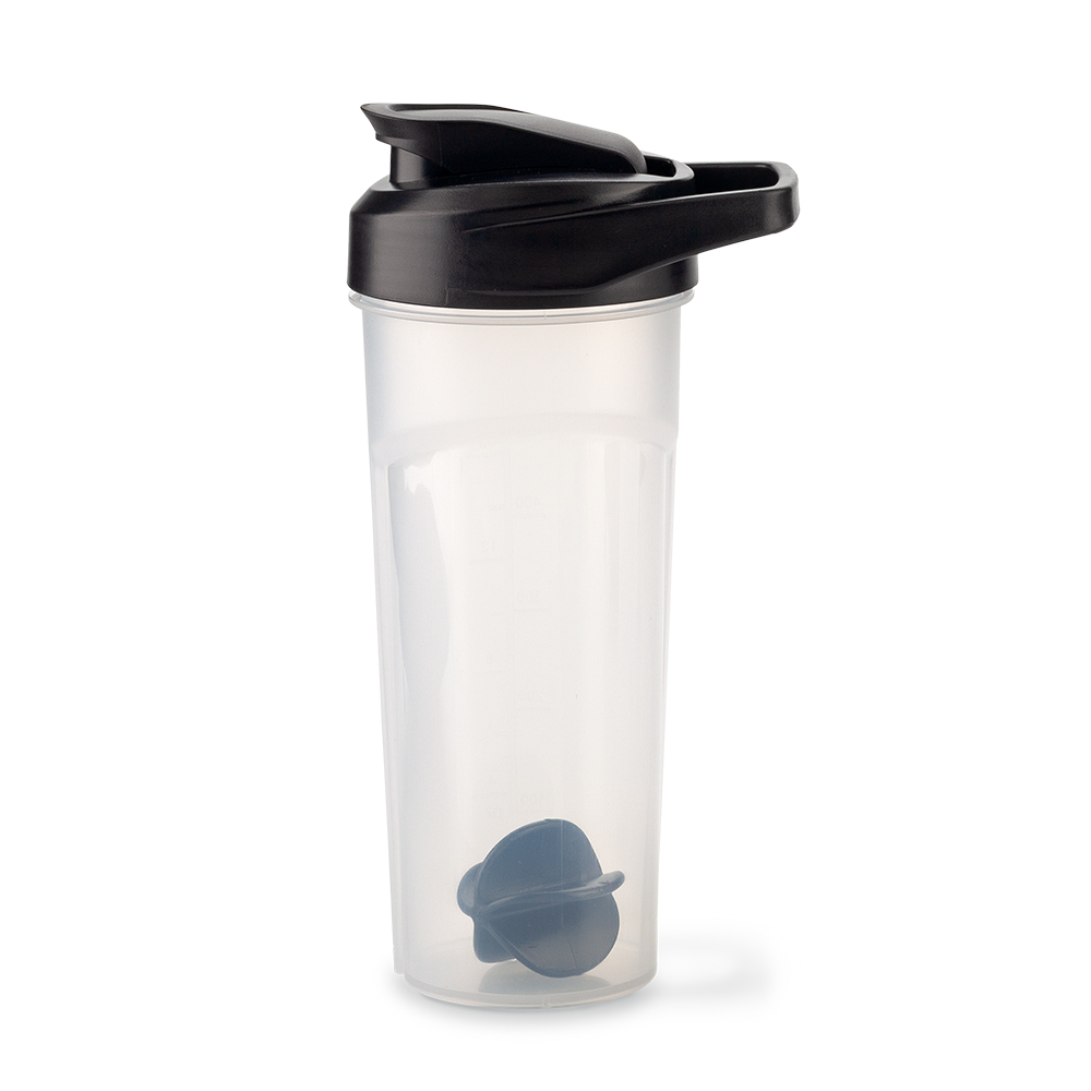 Mug – mezclador plástico con tapa pestaña de rosca. Incluye bola mezcladora (Shaker). Medidas: 21.5 cm x 7 cm diámetro. Marca: 4 cm / Tampografía.