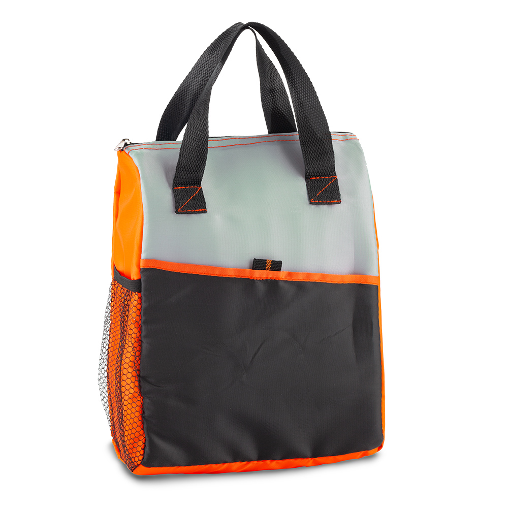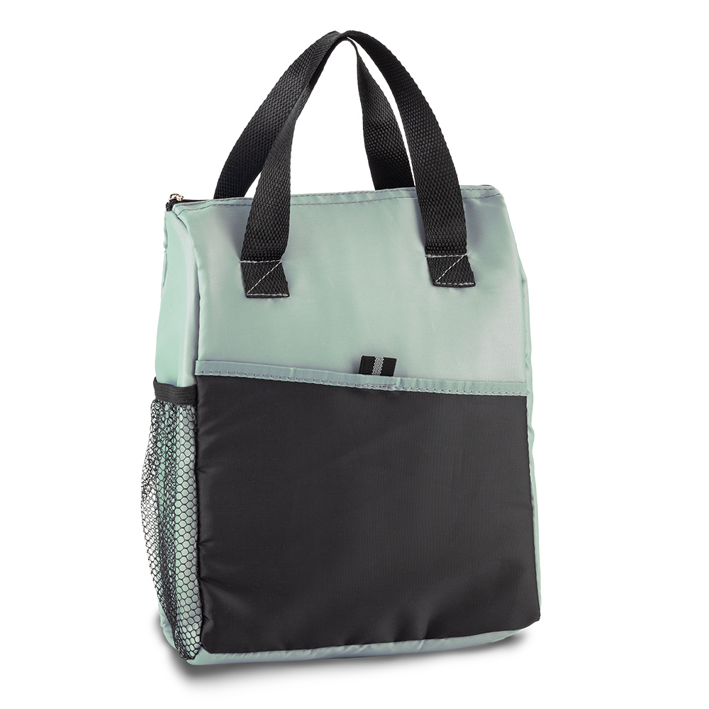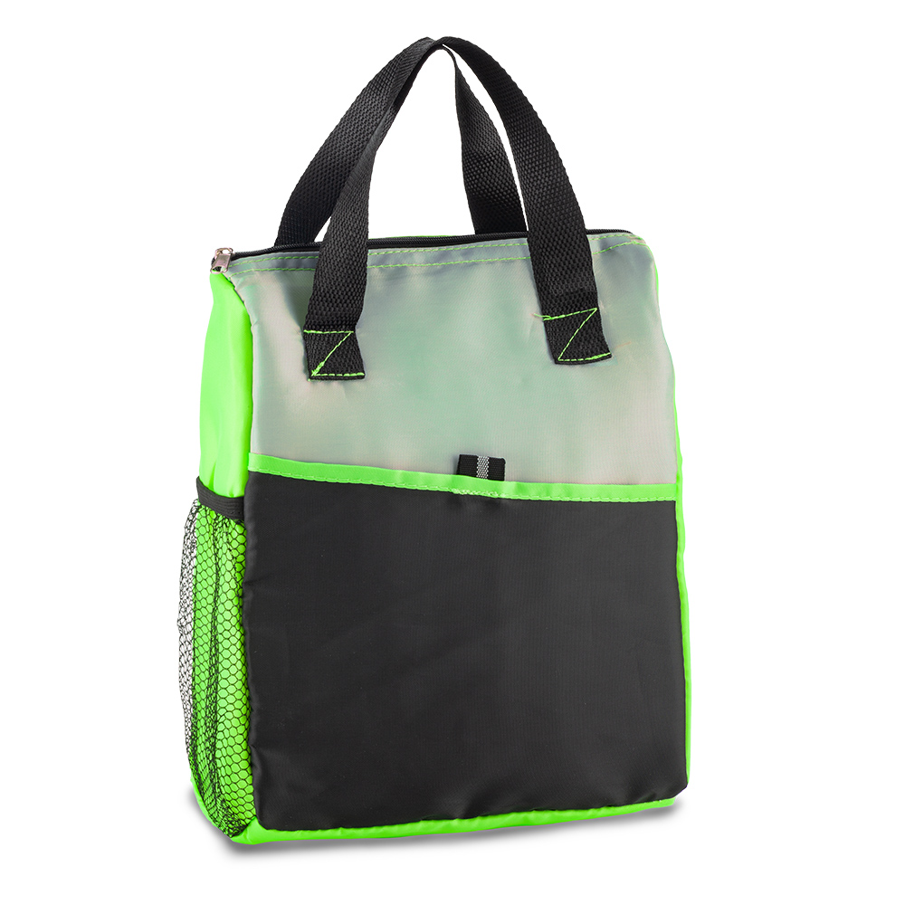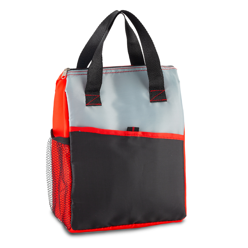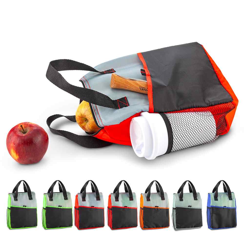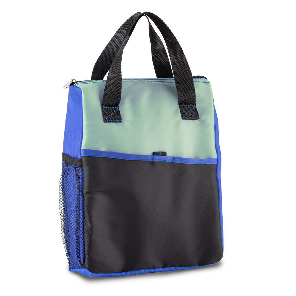 En poliéster, con interior en PVC, bolsillo exterior y malla lateral.