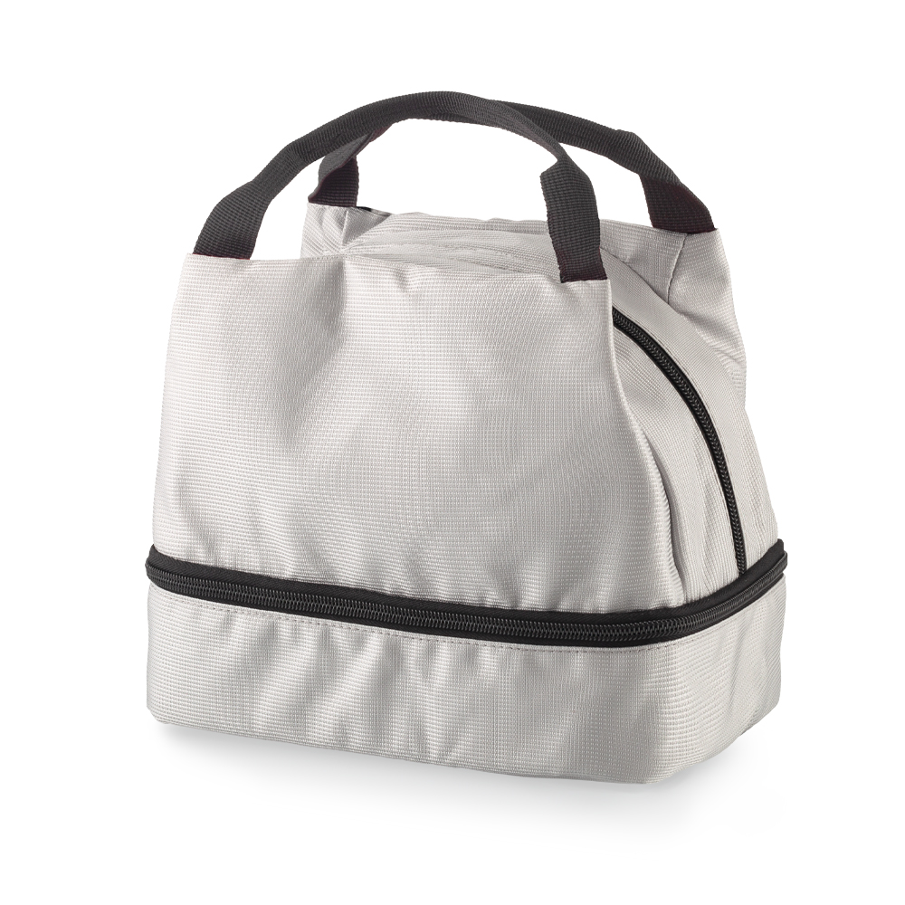 Nevera en poliéster, con interior en aluminio. Dos compartimientos con cremallera.