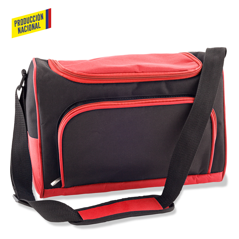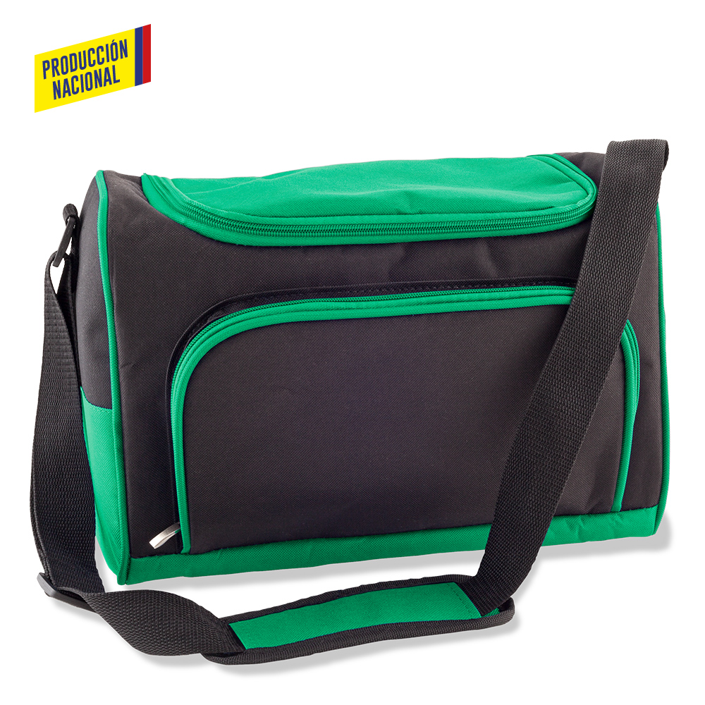 Nevera en poliéster con bolsillo frontal de cremallera y recubrimiento interior que conserva las bebidas o alimentos fríos por más tiempo. Correa ajustable para cargar.
