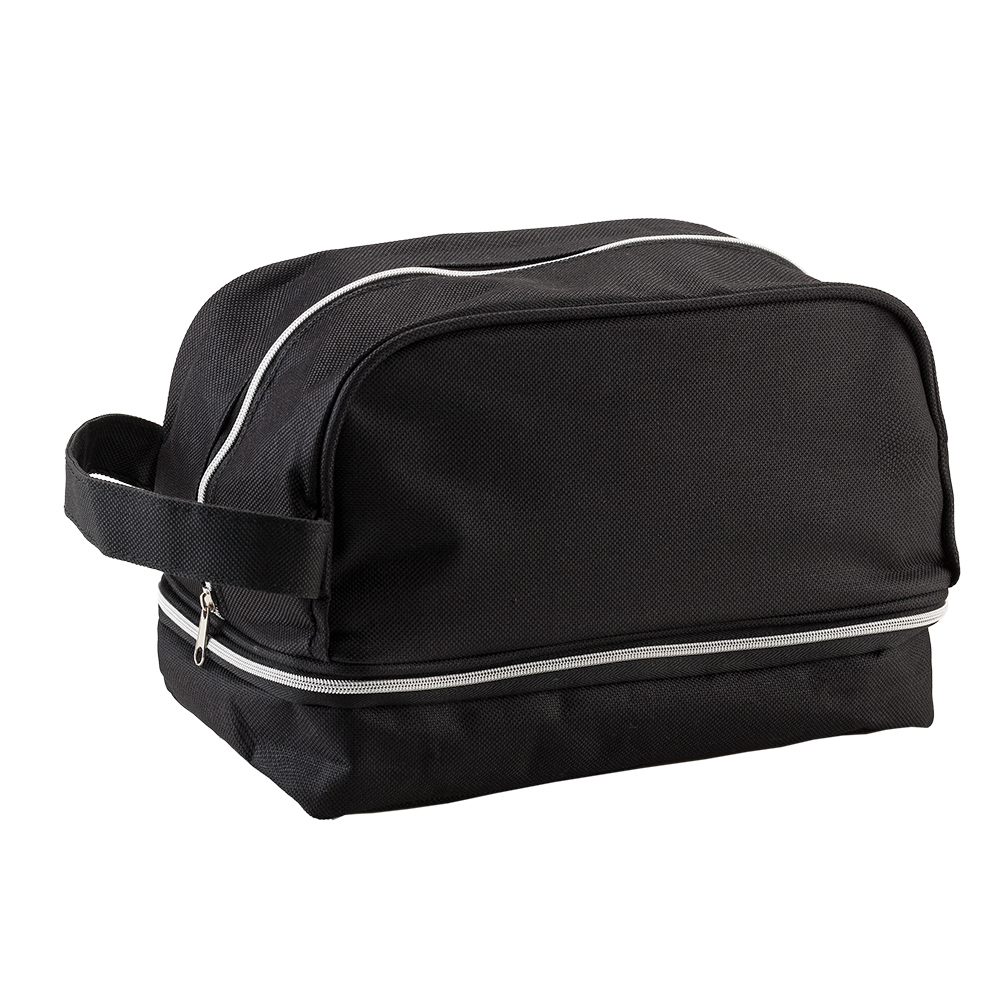 En poliéster, agarradera lateral y dos compartimentos con cierre.