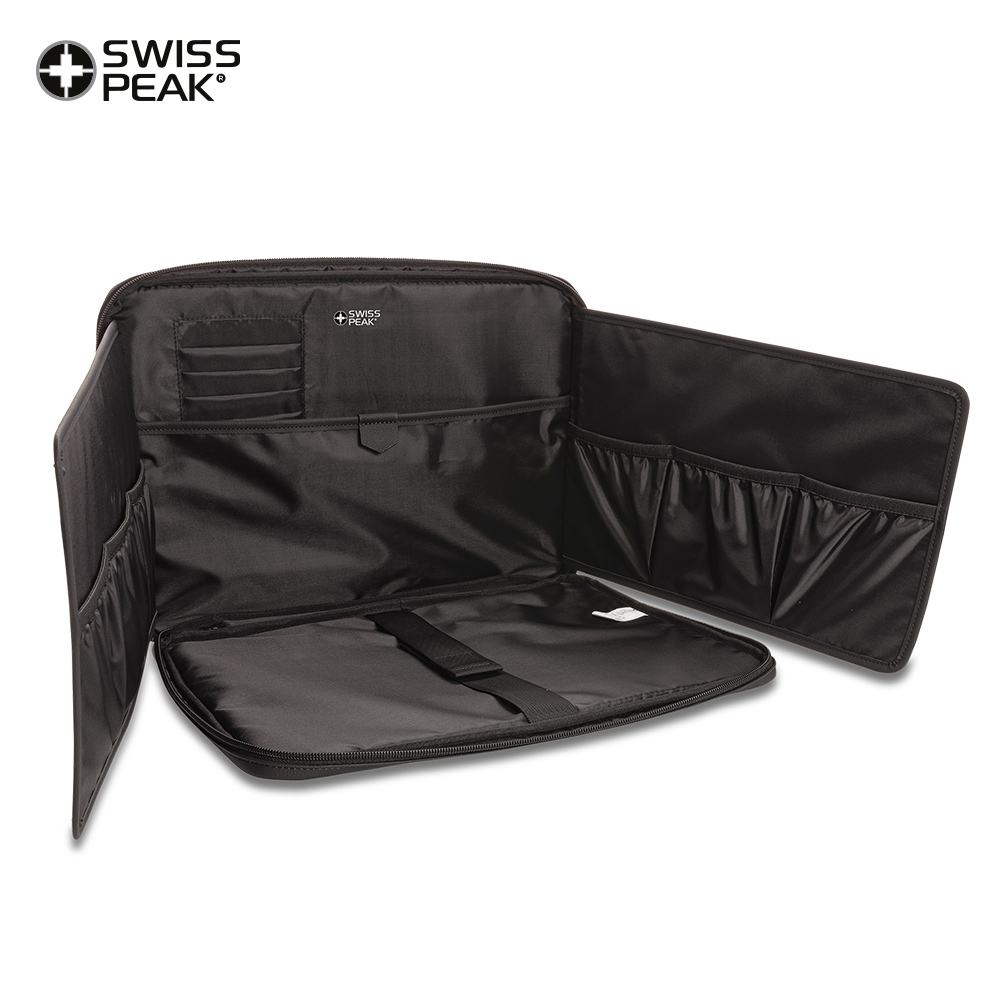 Estación de trabajo con cierre de cremallera y correa de transporte elaborada en Poliuretano imitación cuero. Un bolsillo para portátil de hasta 15.6 pulgadas con cierre de velcro. Al abrir los dos paneles, la funda se transforma en una estación de trabajo. Cada panel cuenta con 3 bolsillos deslizantes y en el interior 5 ranuras para tarjetas y compartimento para documentos. Correa para equipaje en la parte posterior. Libre de PVC.